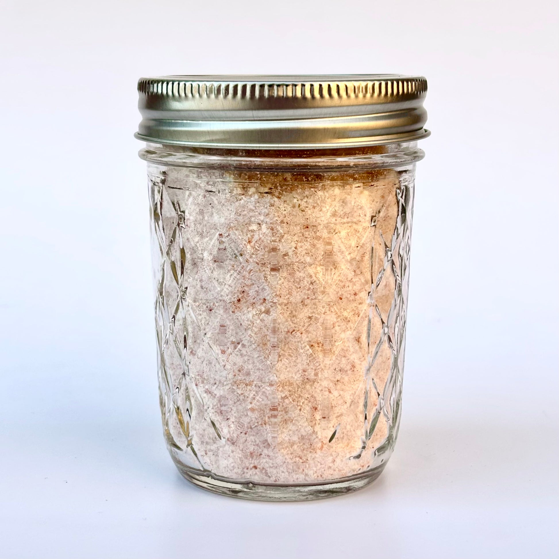 With Himalayan & Epsom salts , baking soda, fresh lime & lemon zest, peppermint & lime essential oils.