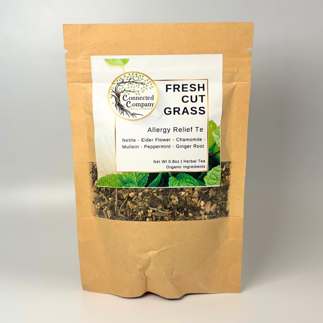 Fresh Cut Grass is an allergy relief herbal tea, carefully crafted with the finest organic ingredients. This blend is formulated with a combination of Nettle, Elder Flower, Chamomile, Mullein, Peppermint, and Ginger root, all known for their natural allergy-fighting properties. With each sip, you'll experience a refreshing burst of mint and energizing notes of ginger, creating a harmonious and delightful flavor profile. Say goodbye to those pesky allergy symptoms and indulge in the soothing benefits of our herbal tea.