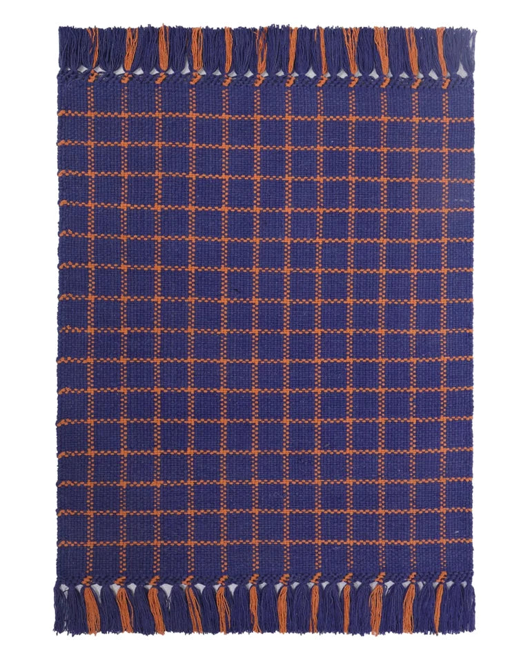The Finarte Ruutu is a tightly woven recycled dark blue cotton rug with a delicate, weaved bright orange square pattern. Long fringes bring a fun extra to the neutral rug. Cotton is easy to maintain, and you can flat-wash the rug by hand at home.