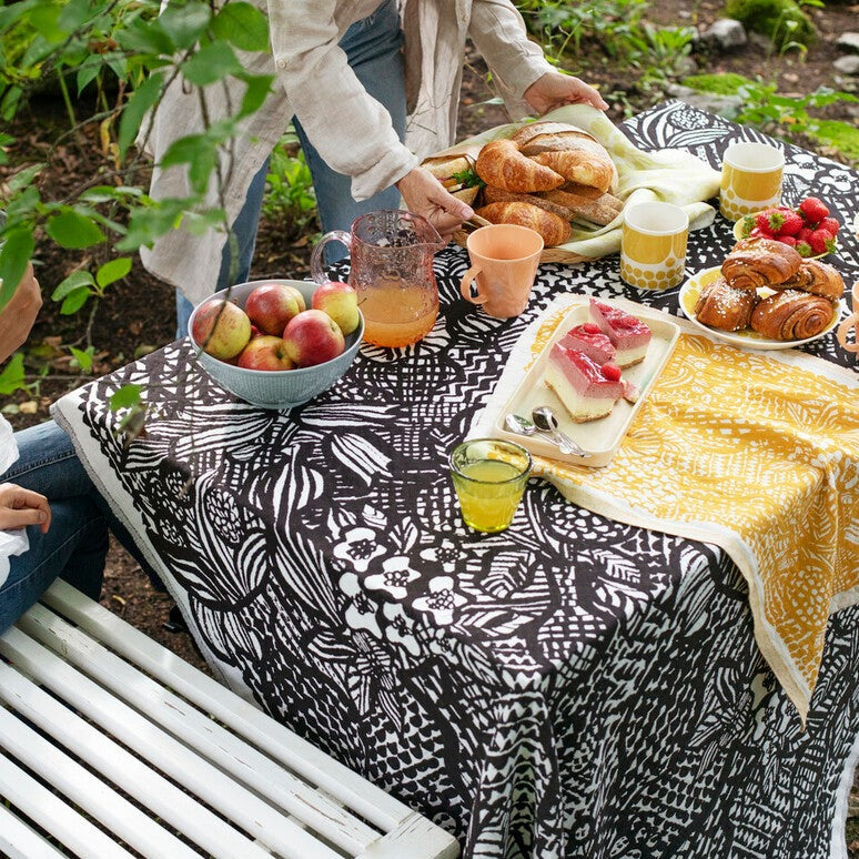 The VERANTA pattern originated from the idea of an old house’s veranda and grandma’s home. Aged ceramic vases filled with hand-picked flowers, doilies and double cloths. I found inspiration in the graphic style of the 40’s and 50’s, with some ethnic influences in the mix.