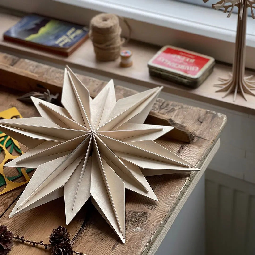 Over the course of assembly, a small hole resembling a snowflake forms in the middle of the star, letting natural light pass through it in a beautiful fashion. The pattern is at its most visible when hanging the star in front of a window.