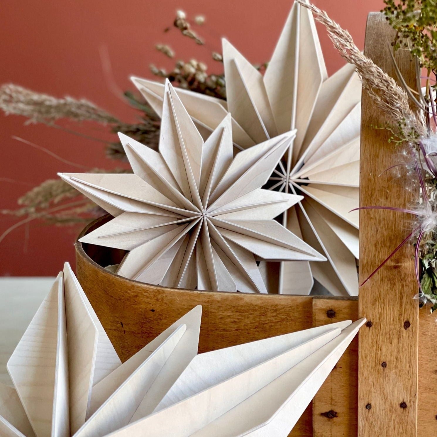 Do-it-yourself Star ornaments. Eco-Friendly. Natural wood version can be painted and decorated by DIY enthusiasts.