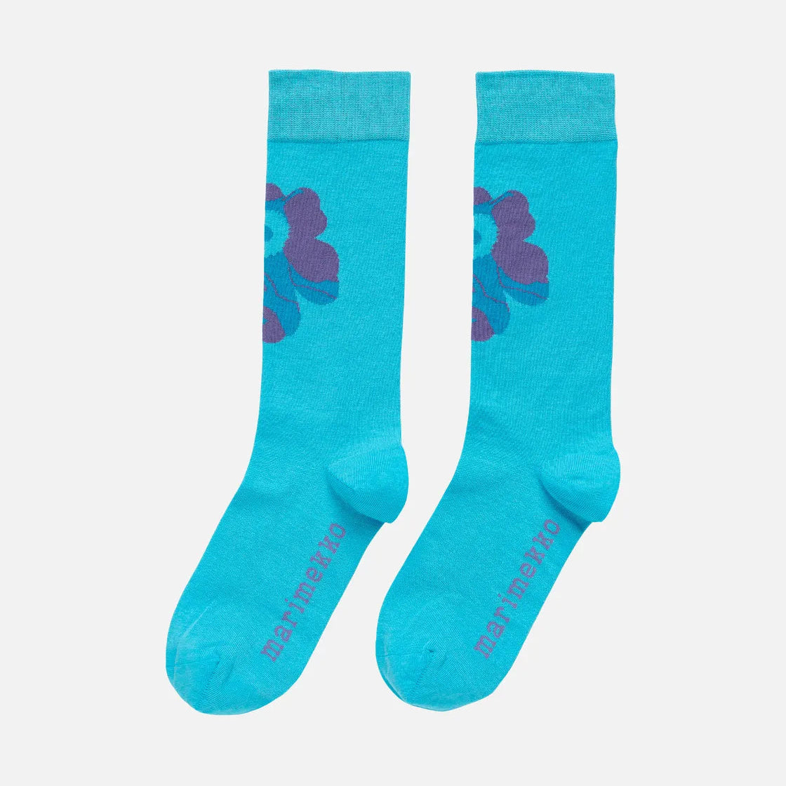 The Detsku Unikko Logo socks are made of a cotton blend, and they feature one large Akvarelli Unikko pattern flower, which looks like it was painted with watercolours. Socks has Marimekko logo text on the bottom of socks.