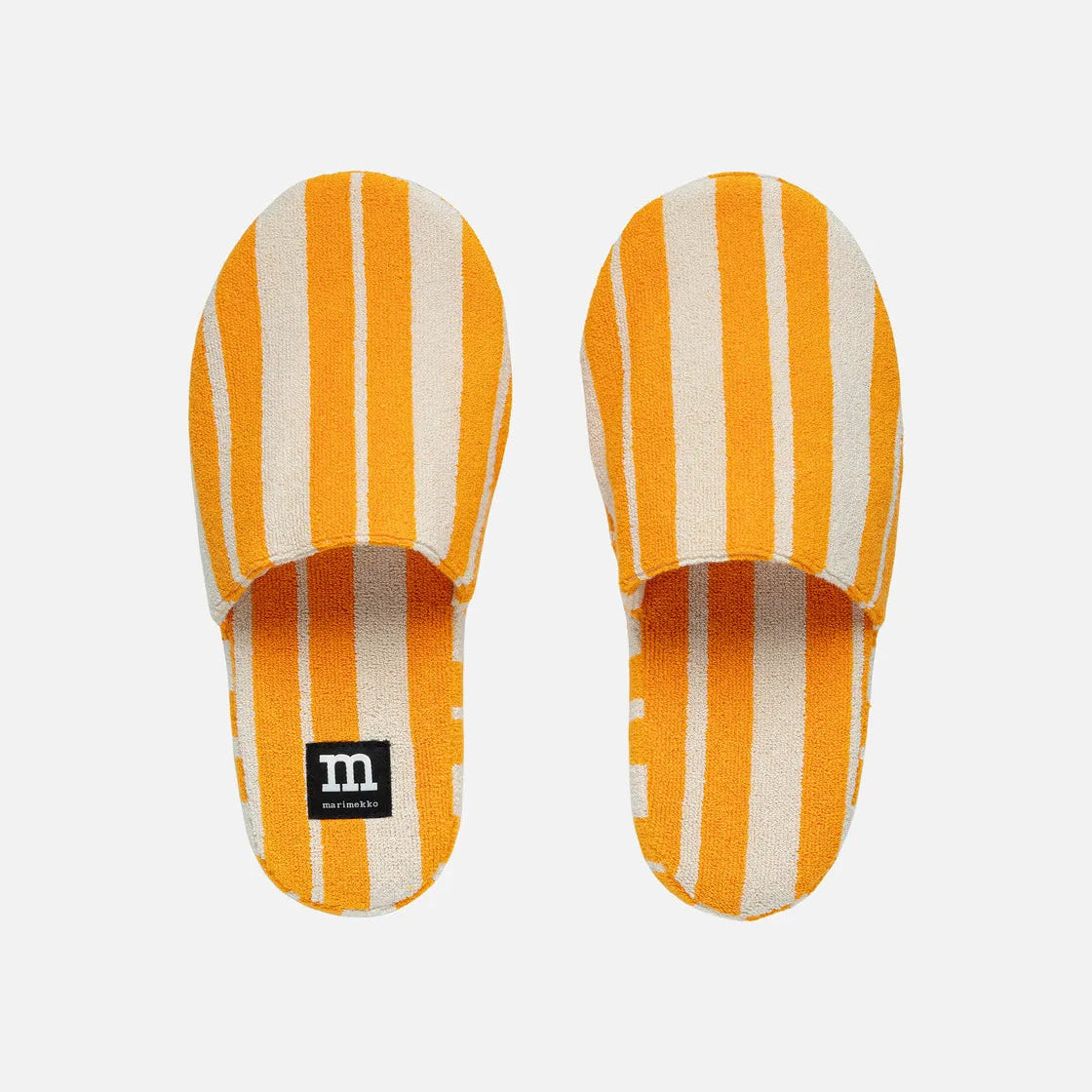 The Raide pattern slippers have rubber soles and they come in three different sizes. Stripes have always been an integral part of the world of Marimekko patterns. The vivid freehand Raide (railroad track) is one of the innumerable Marimekko stripes created by Annika Rimala.