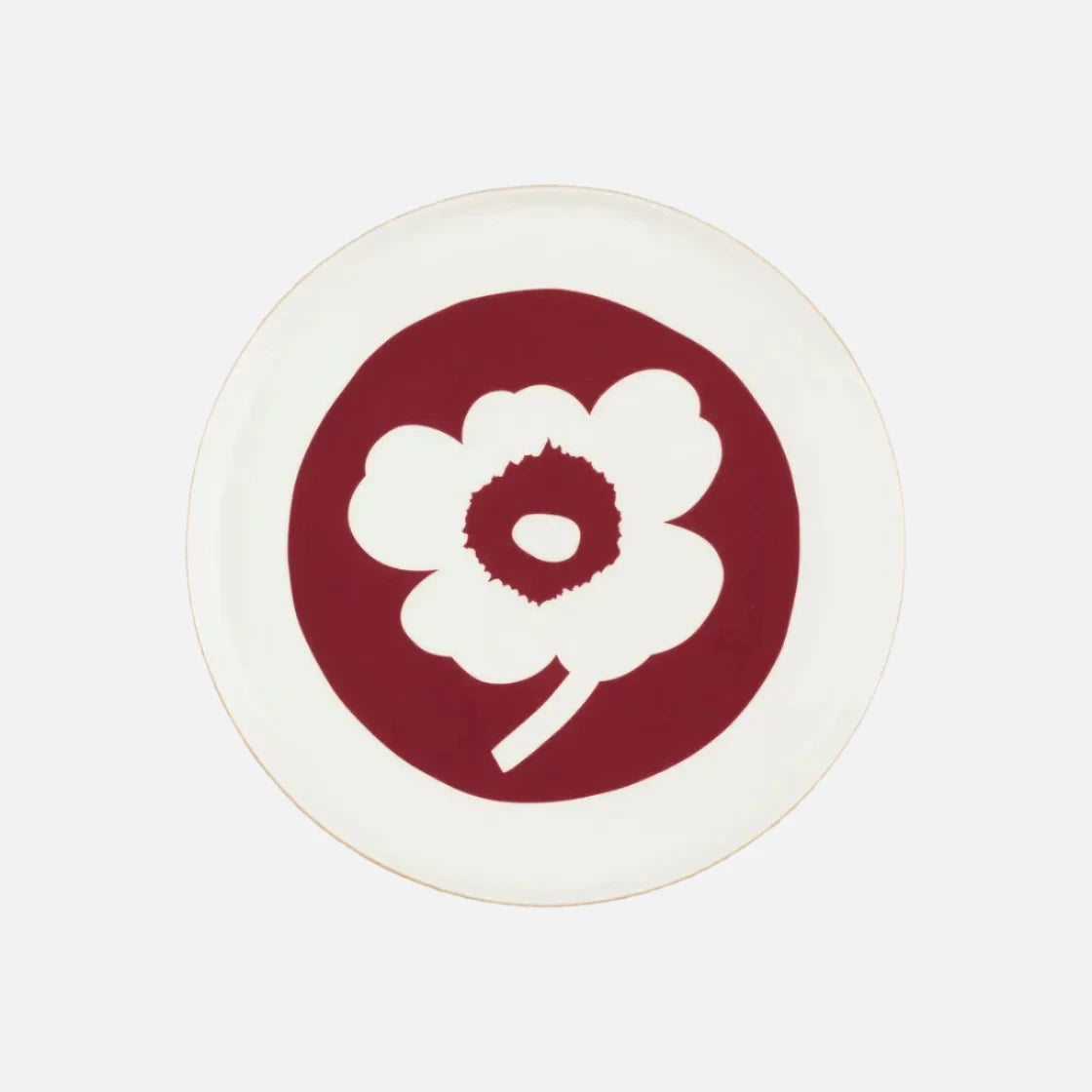 The Oiva plate is made of white stoneware, and it is dishwasher, oven, microwave, and freezer safe. The plate features the Unikko flower in the middle and a blue, hand-painted rim.
