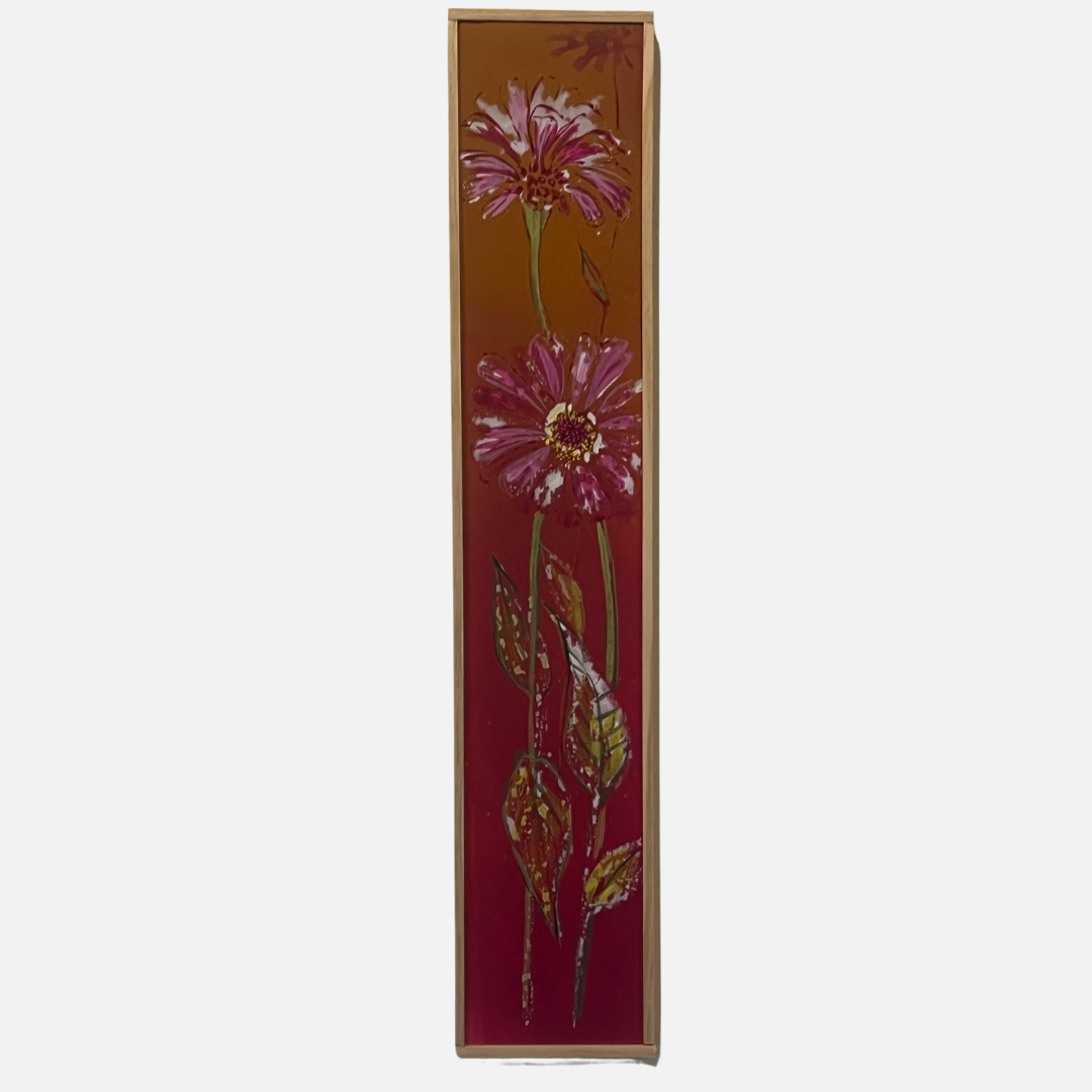 Milwaukee artist Mike Kasun painted "ZINNIAS!", an original one of a kind acrylic painting on a block with a handmade wood frame , which measures approximately 4 x 19.5"