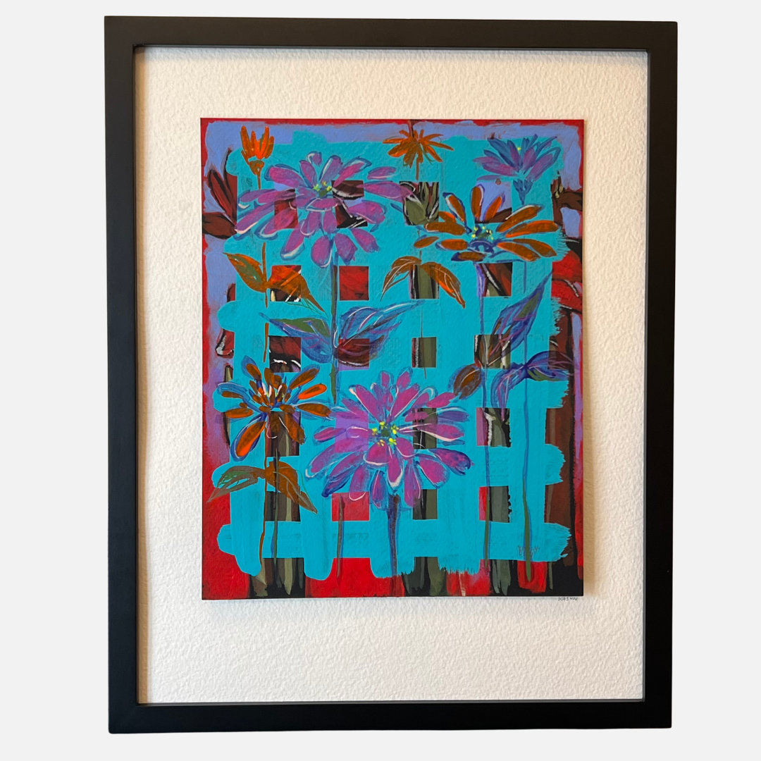 Milwaukee artist Mike Kasun painted "Zinnias", an original one of a kind acrylic with a black frame, which measures approximately 12" x 15".
