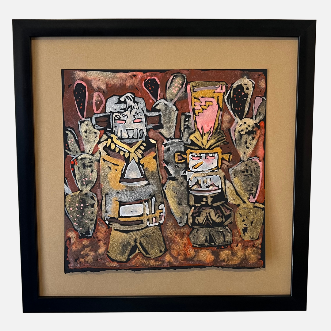 Milwaukee artist Mike Kasun painted "Kastinas de Casa Rina", an original one of a kind pearlescent watercolor with a black frame, which measures approximately 13" x 13".