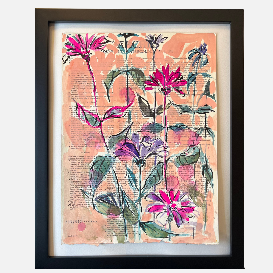 Milwaukee artist Mike Kasun painted "International Zinnias", an original one of a kind acrylic painting with a black frame, which measures approximately 12" x 15".