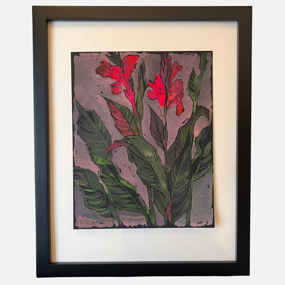 Milwaukee artist Mike Kasun painted "duskblooms", an original one of a kind gouache painting with a black frame, which measures approximately 12" x 15".