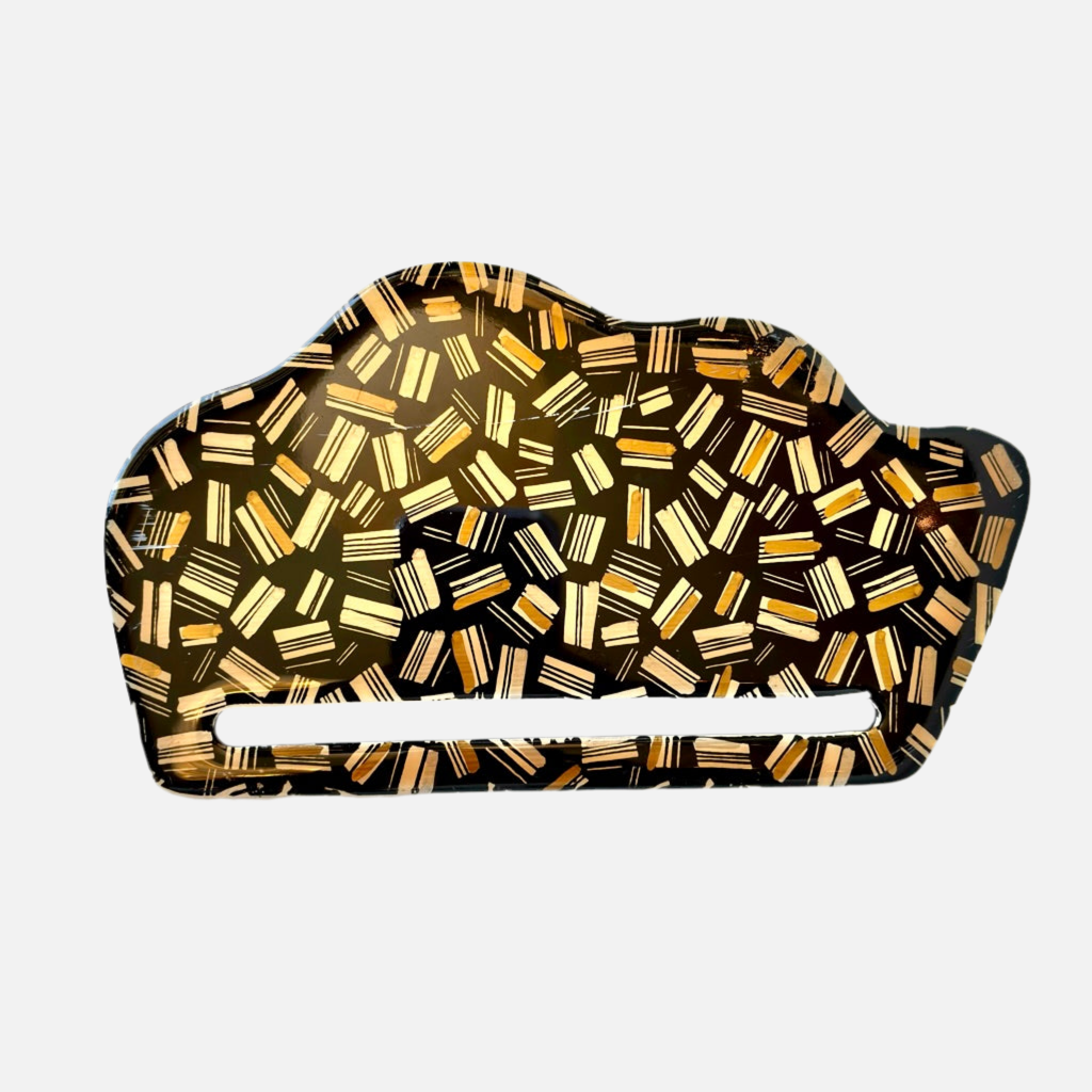 These Moon Bag handles were designed by artist Patricia Smith in Milwaukee in the 1980s, and offer the perfect balance of artistic craftsmanship, design, and practicality. The outstanding feature that made it a "Moon Bag" was its limited run of hand painted, unique motifs on each handle. These handles may be interchanged with others, which give the wearer creative control over the design of the bag itself, and the hand-painted work displayed on the plate. You can add them to a purse, sew your own creation, display them as artwork, or even use them as an ultra-fabulous chip bag closure!