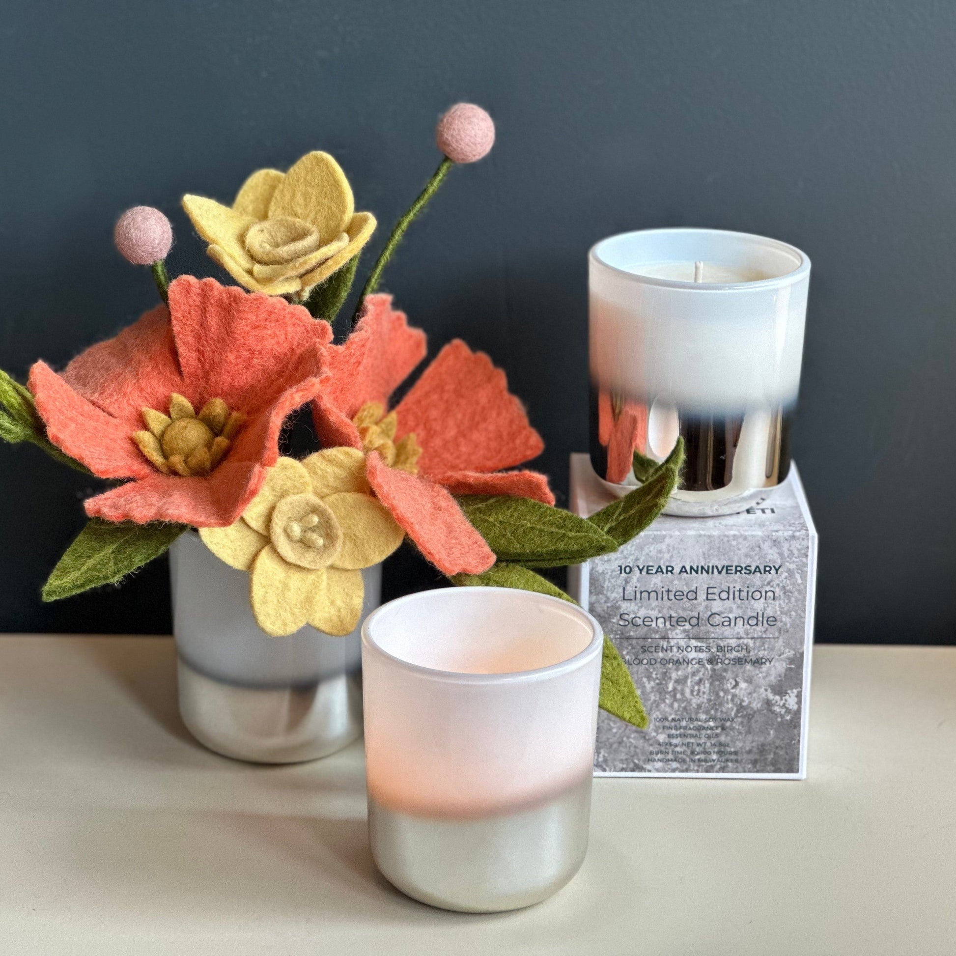 To celebrate our 10 year anniversary we've created a Limited Edition version of our iconic Olson House candle in partnership with Big White Yeti. This fabulous white and silver ombre vessel is larger than our standard candles so you can get extra hours of burn time of your favorite Olson House scent! Even better, this vessel is not just a candle holder, but can be wiped clean when the candle is burned down and reused to hold whatever your heart desires - flowers, toiletries, pens/pencils, etc. This exclusive candle comes in a white gift box. Limited quantities of this special candle are available, don't wait and grab one before they're gone!