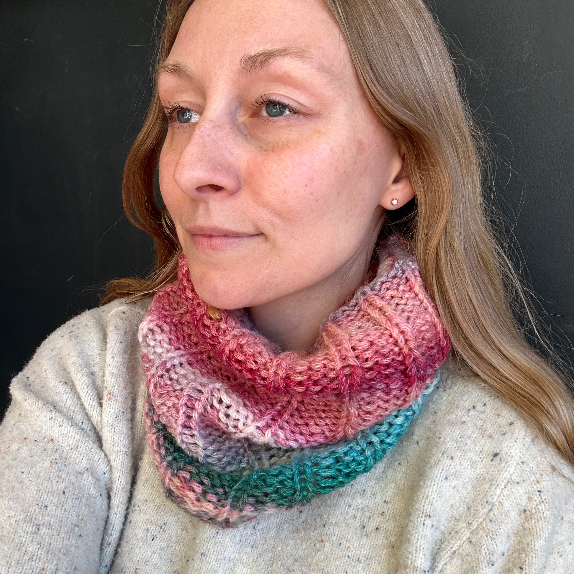 Beautiful hand knit cowl scarf, made with a fun rainbow of colors and washable wool. Percy Knits scarves and shawls are hand made with care in Milwaukee, WI.