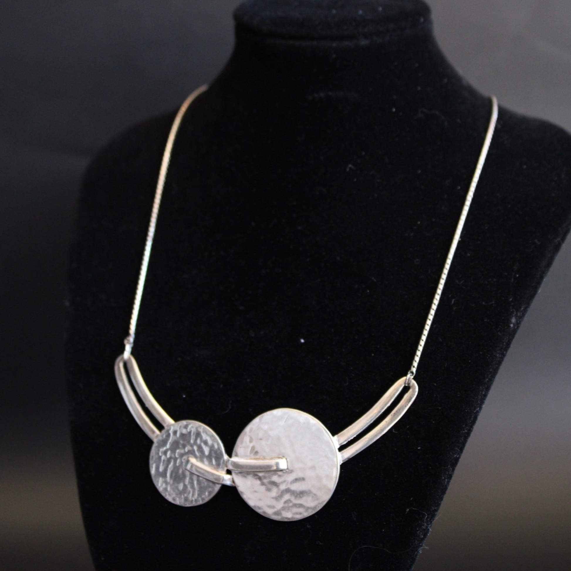 Necklace measures 15.5" long, and is a must have for any jewelry collector interested in modern Bauhaus jewelry. Some tarnish from age.
