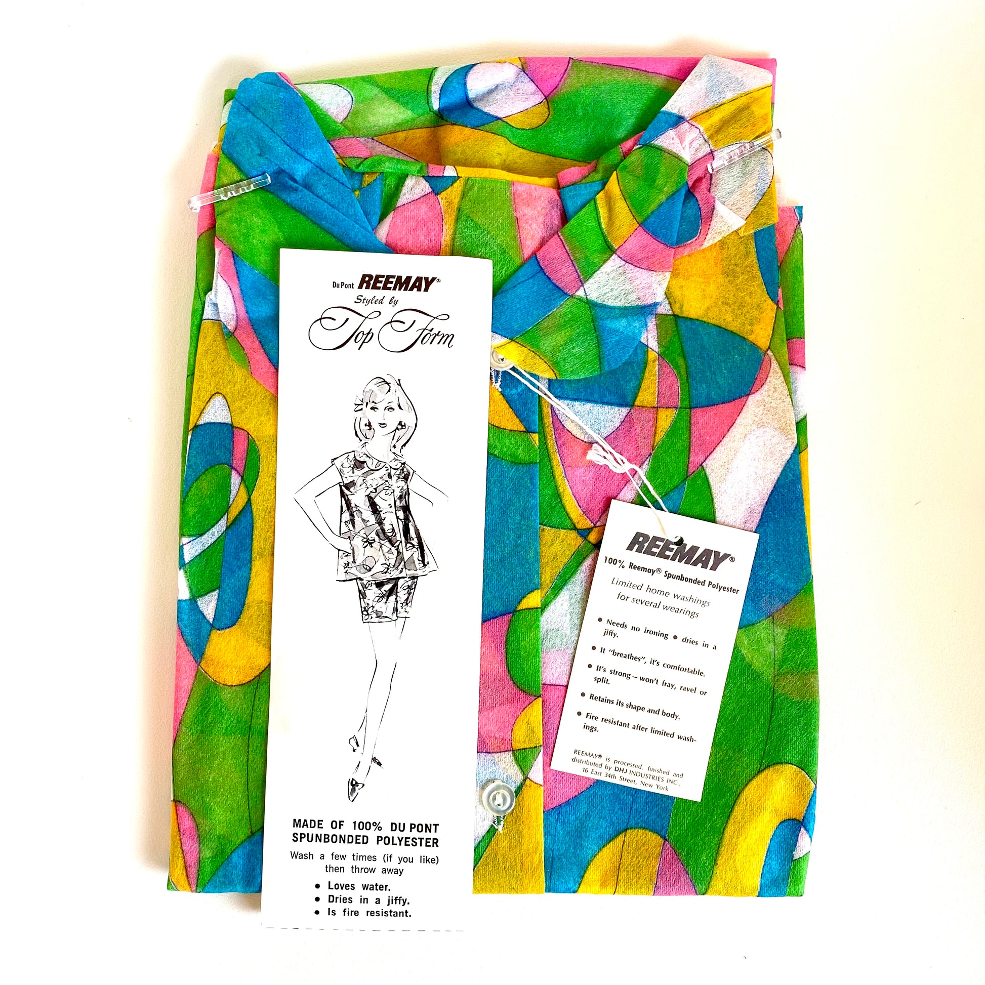 The 1960's were a different time, when those with disposable income wanted high fashion, with the ability to move on when the seasons changed. In comes Dupont with the Reemay fabric in amazing mod patterns & colors! The 100% Dupont spunbonded polyester "loves water, dries in a jiffy & is fire resistant. Wash a few times (if you like) then throw away". We recommend not tossing this cool vintage time capsule. Instead perhaps wear for a fun event, on vacation, or hang as art.