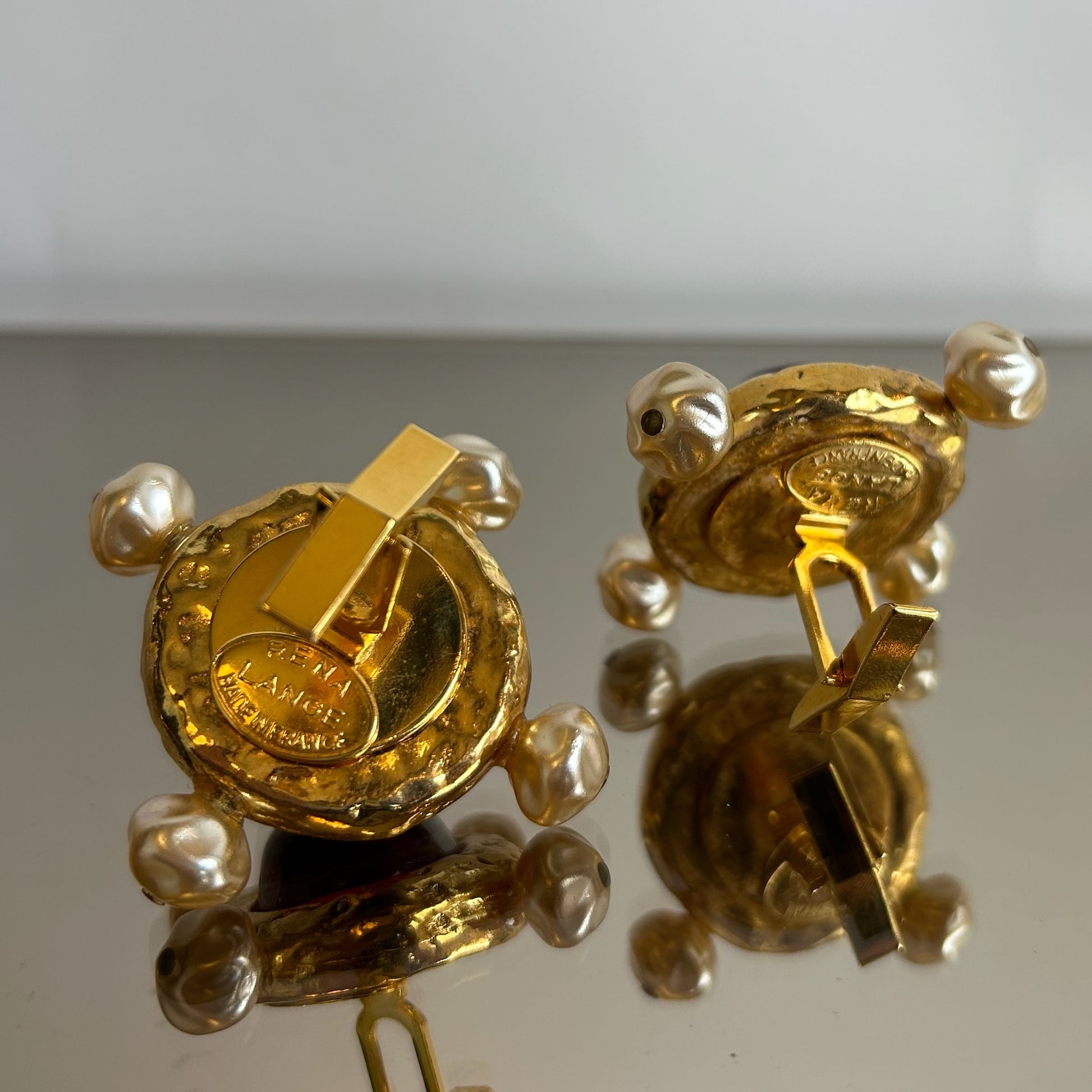 These unique and daring cufflinks feature a bold red glass center and possible cultured pearls in gold tone. Made in France. A sophisticated and hard-to-find piece for collectors and style enthusiasts.