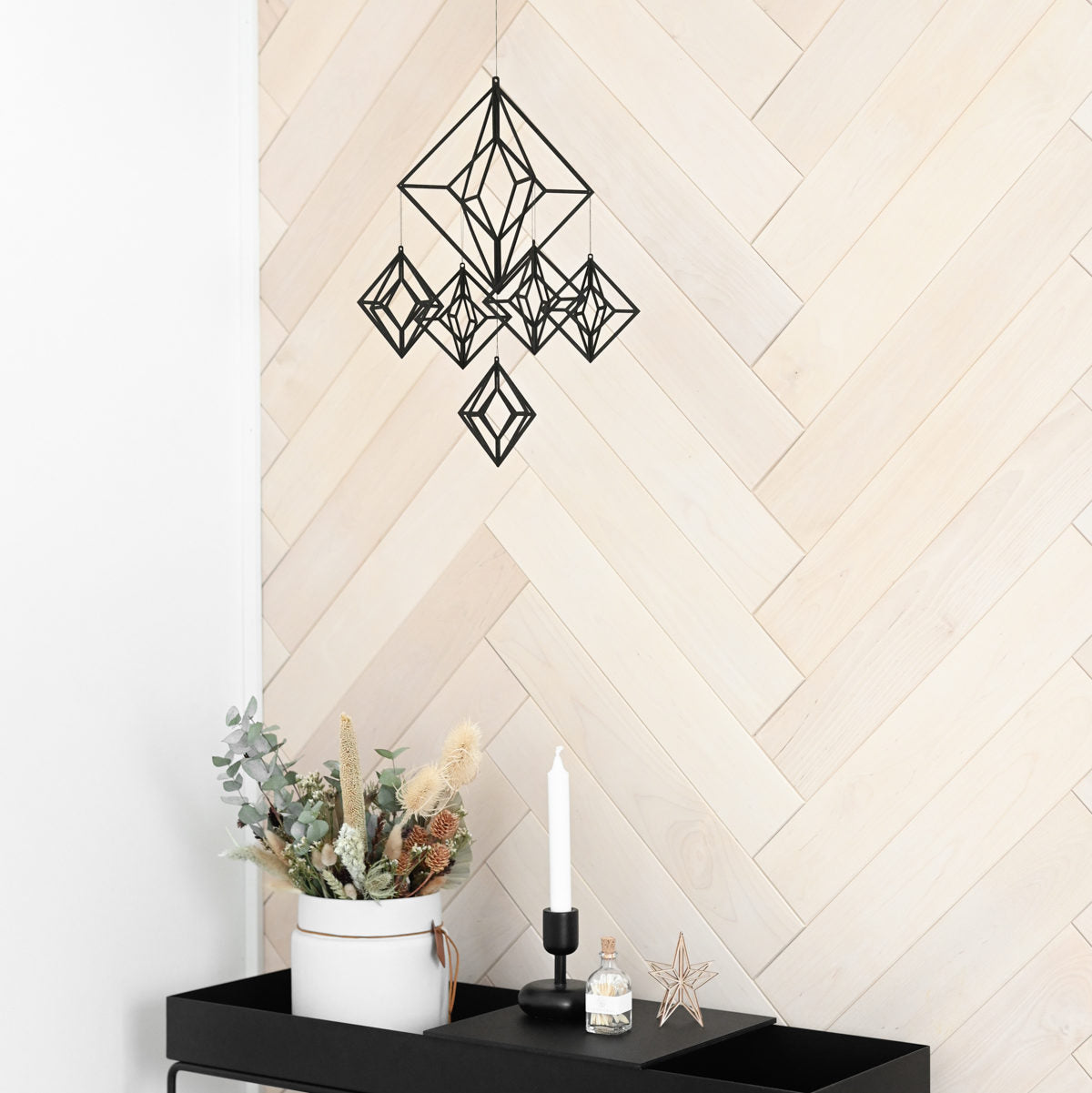 The elegant Himmeli I mobile is made of 100% sustainably sourced Finnish birch plywood. It is assembled from separate parts that are easy to join together. It is also easy to reassemble due to its design and material. The wood is hand-dyed black so that its fibres stand out beautifully from beneath the dark colour. The feather-light decoration does not require heavy fastenings.
