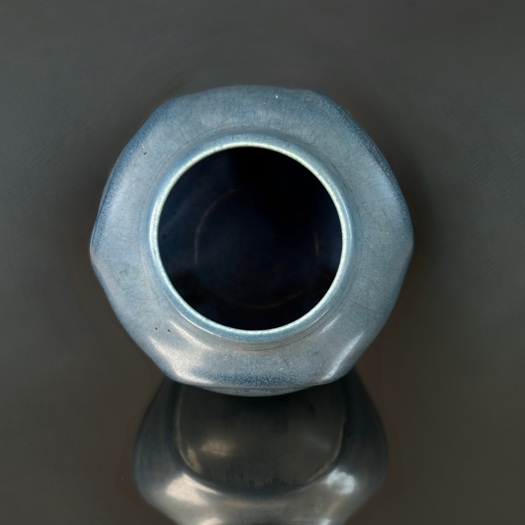 This gorgeous deep blue matte glazed orb-esque Rookwood vase features a modern organic curves, 3 small legs & design number 2093 stamped on bottom. It was crafted in 1925, and is in great vintage condition, with minimal signs of wear consistent with age. Rookwood stamp of authenticity on bottom.