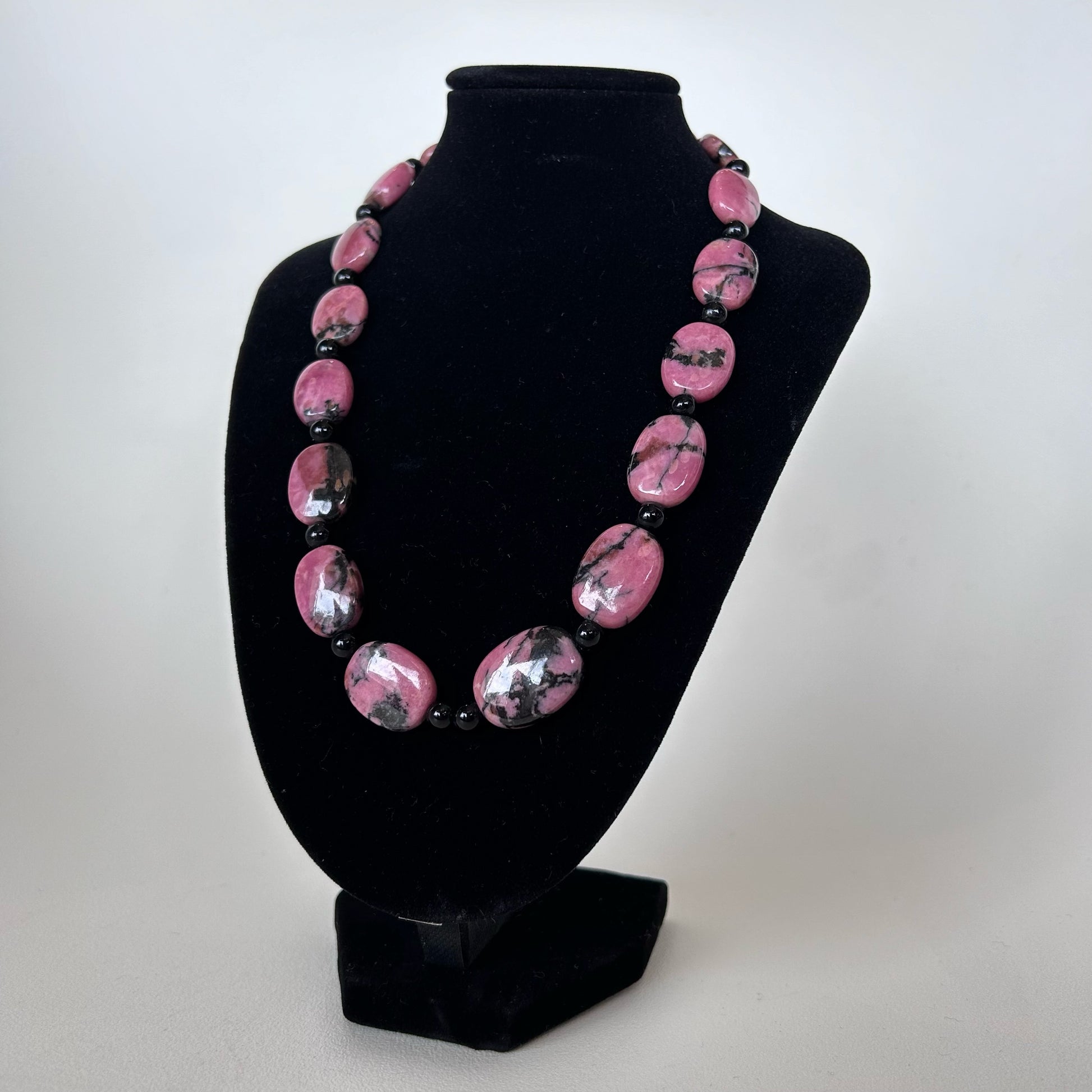 This necklace features 1940's rhodonite stones, restrung with black crystals and a hook and eye clasp. The rhodonite stones are a beautiful rose color with slivers of brown and black throughout.