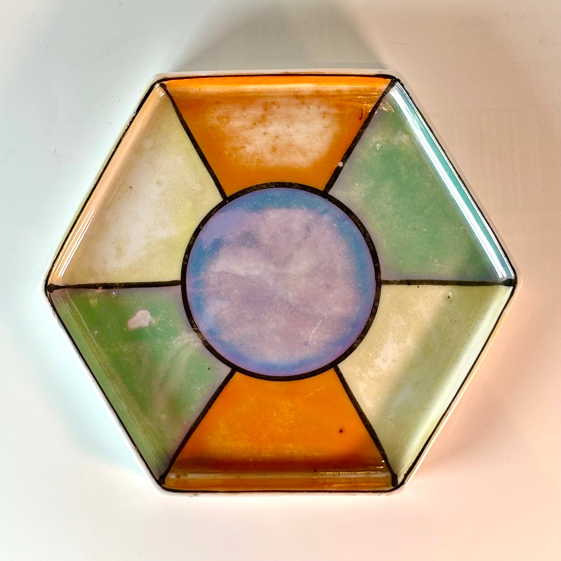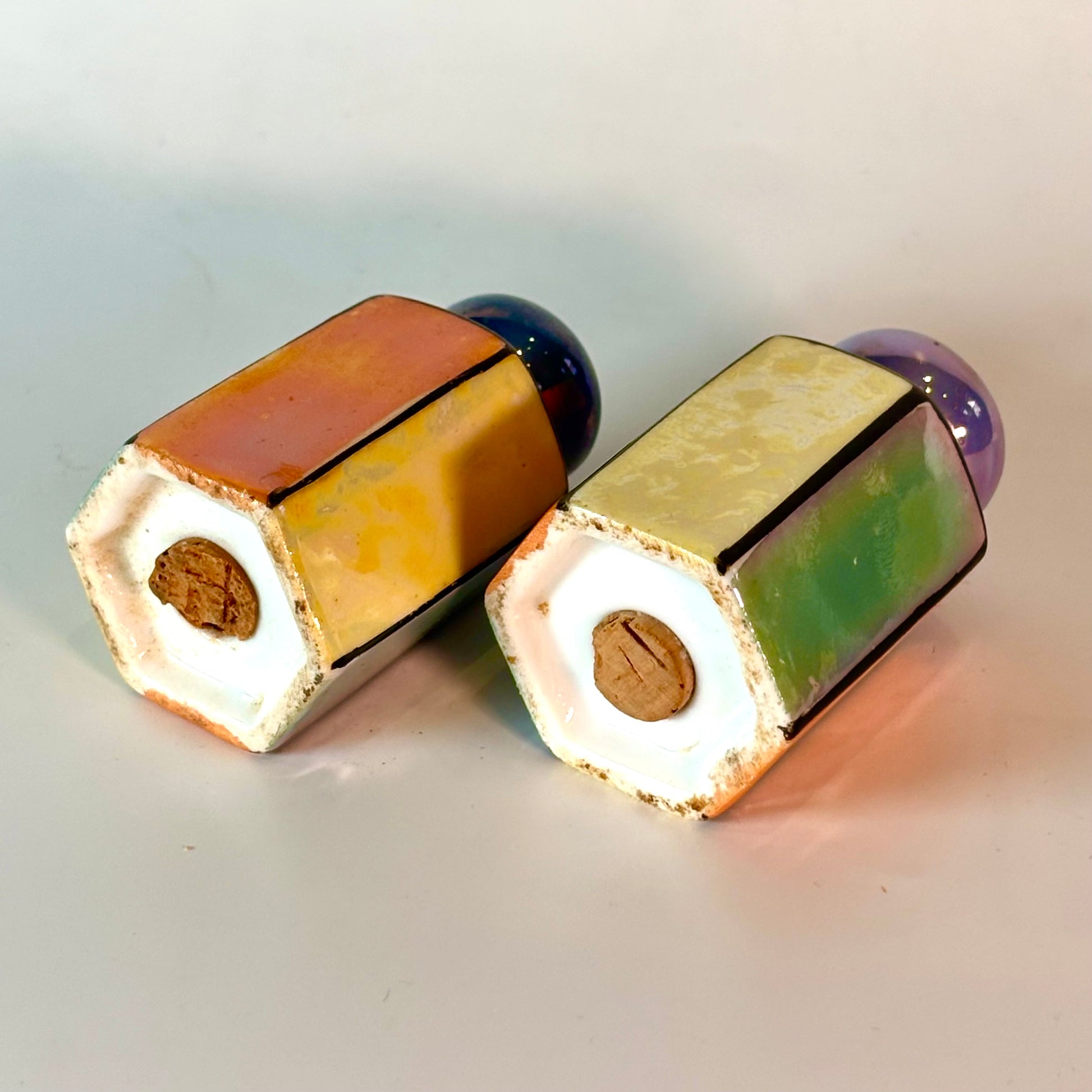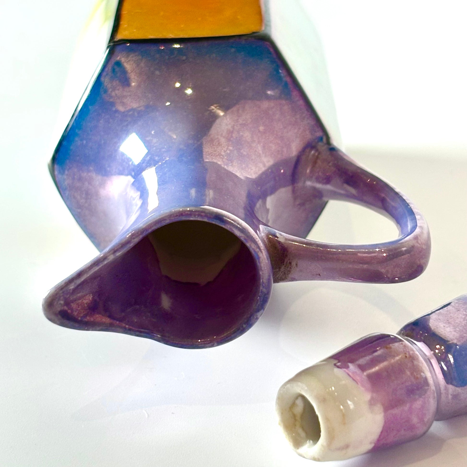 Transport yourself to the elegance of the 1933 Chicago World’s Fair with this striking multicolored Art Deco lustreware set, a rare souvenir crafted in Japan. Featuring hexagonal shapes and radiant iridescent finishes, these pieces showcase bold Deco design, combining visual allure with exceptional collectibility.
