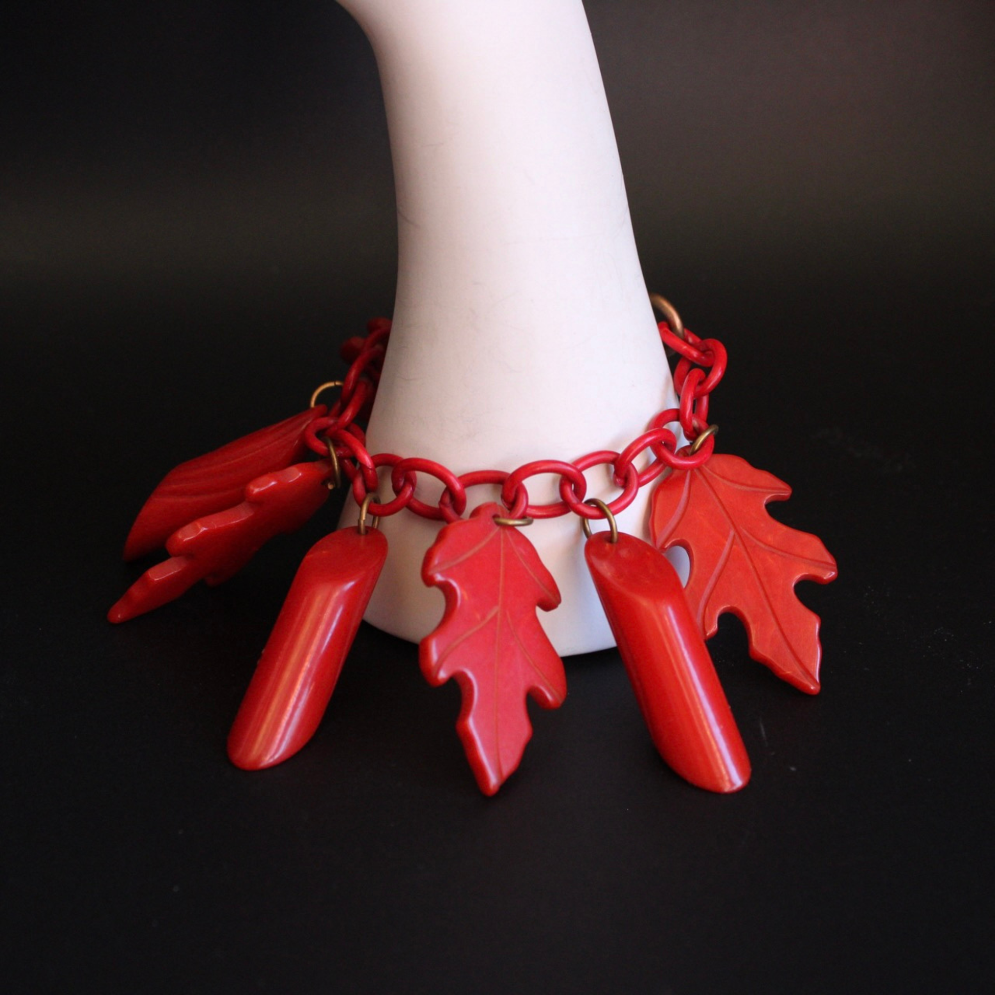 Stylish whimsy abounds in this 1940's cherry-red Bakelite oak leaf & log bracelet, with matching celluloid links. This necklace is in great condition for its age, and is a rare find. It measures 8" long, with 2" long leaves & logs.