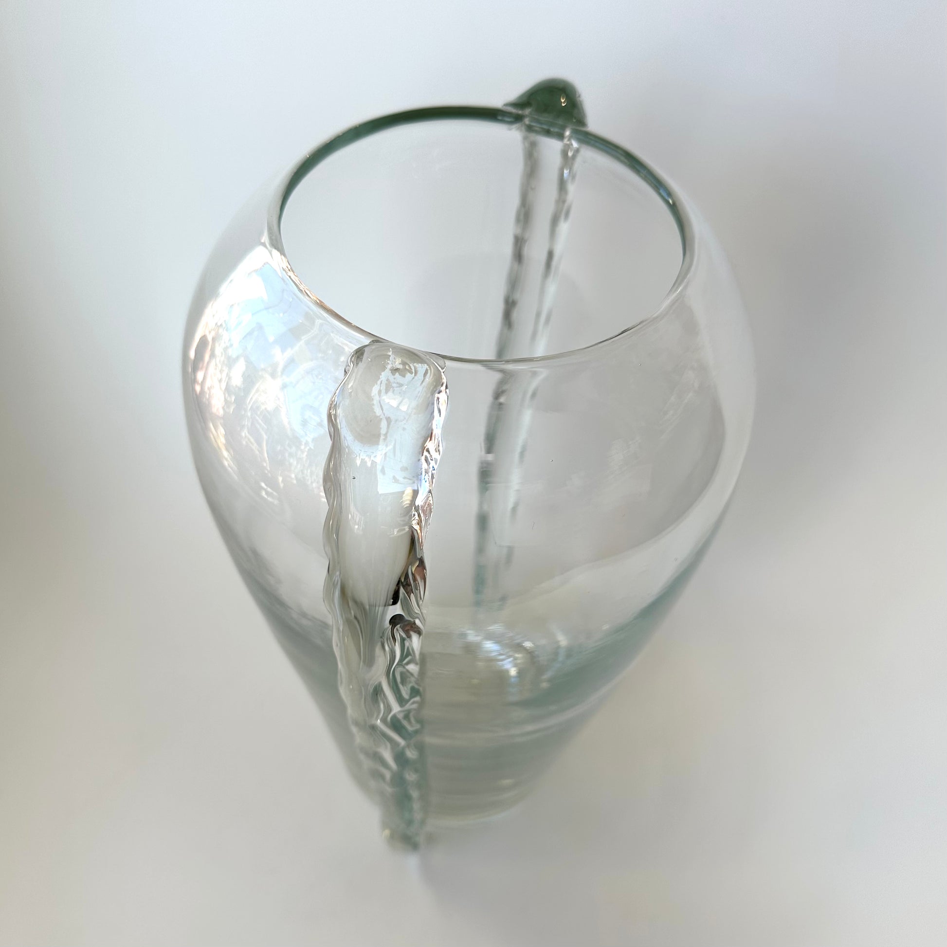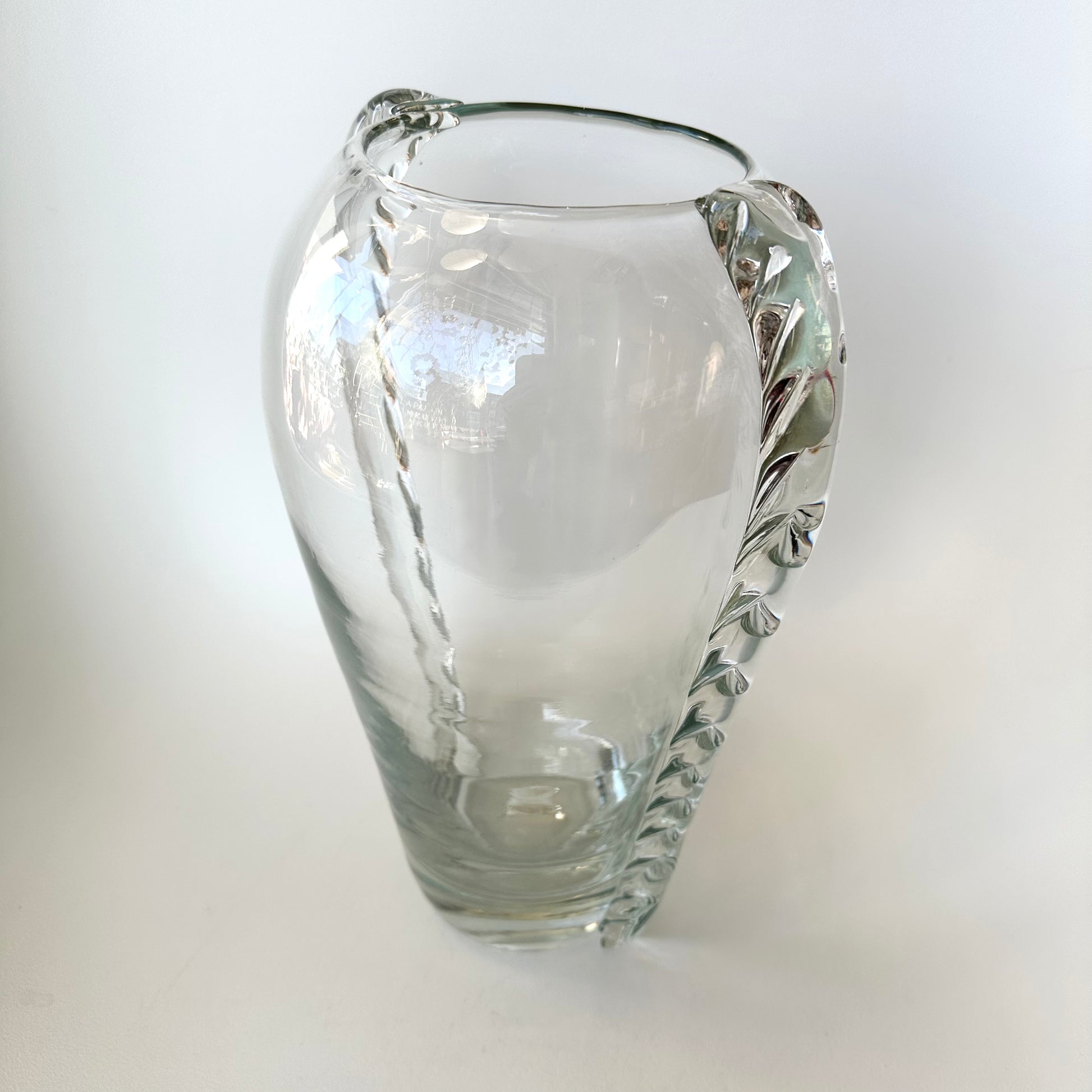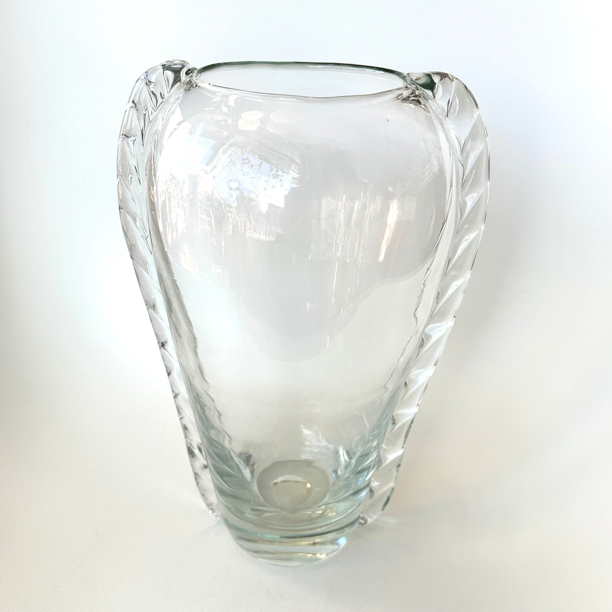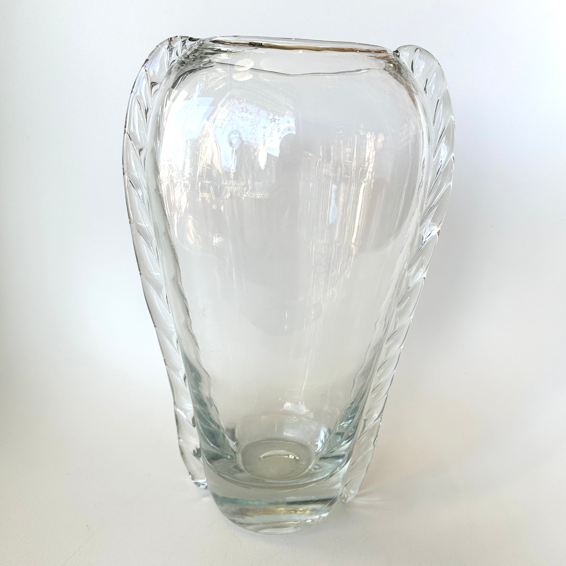 This gorgeous vintage hand-blown Barovier Venetian glass vase is in great condition, with no chips, cracks or imperfections. The vase is clear glass with unique roping detail on the sides. It measures 12.5" tall x 7" wide and has a 4" opening.