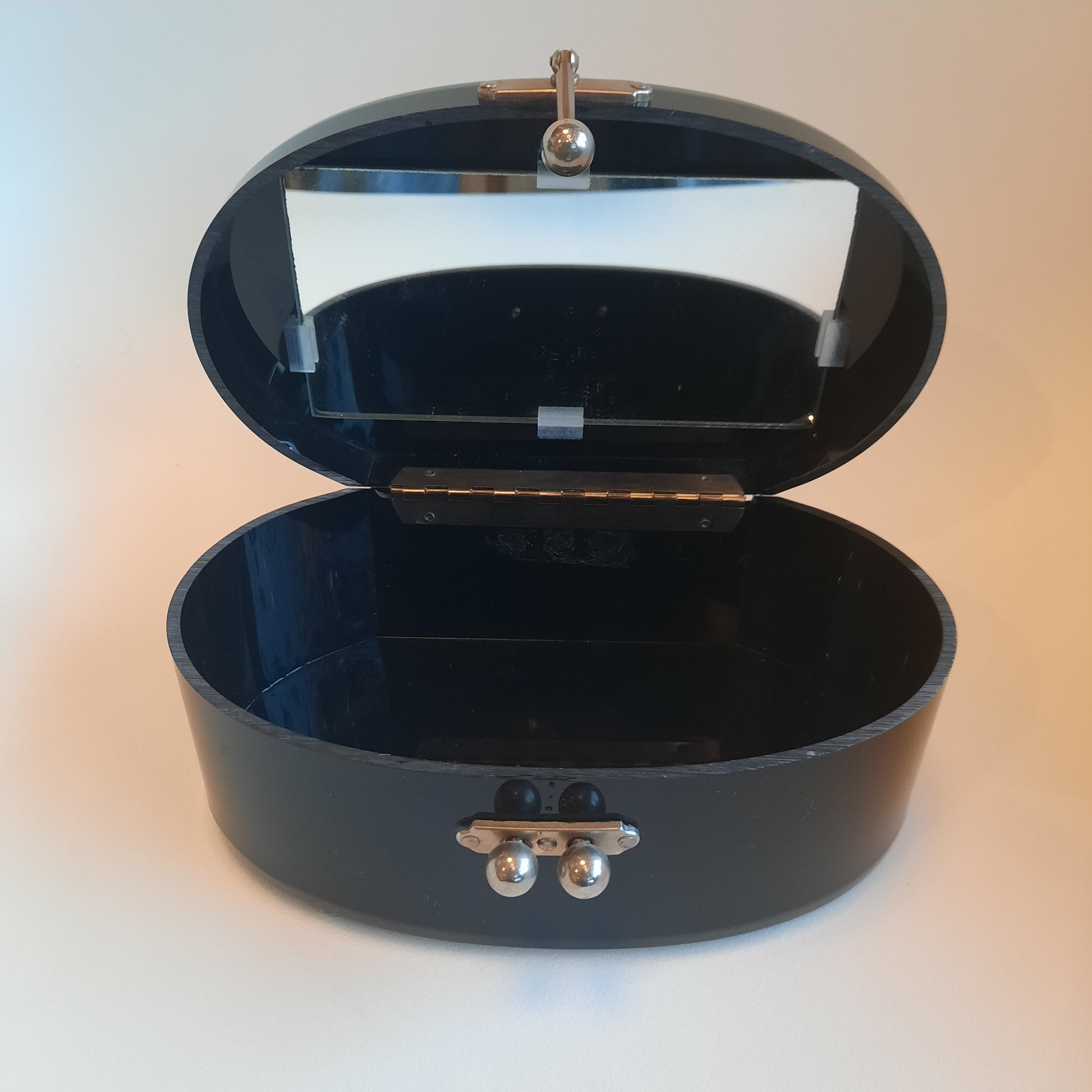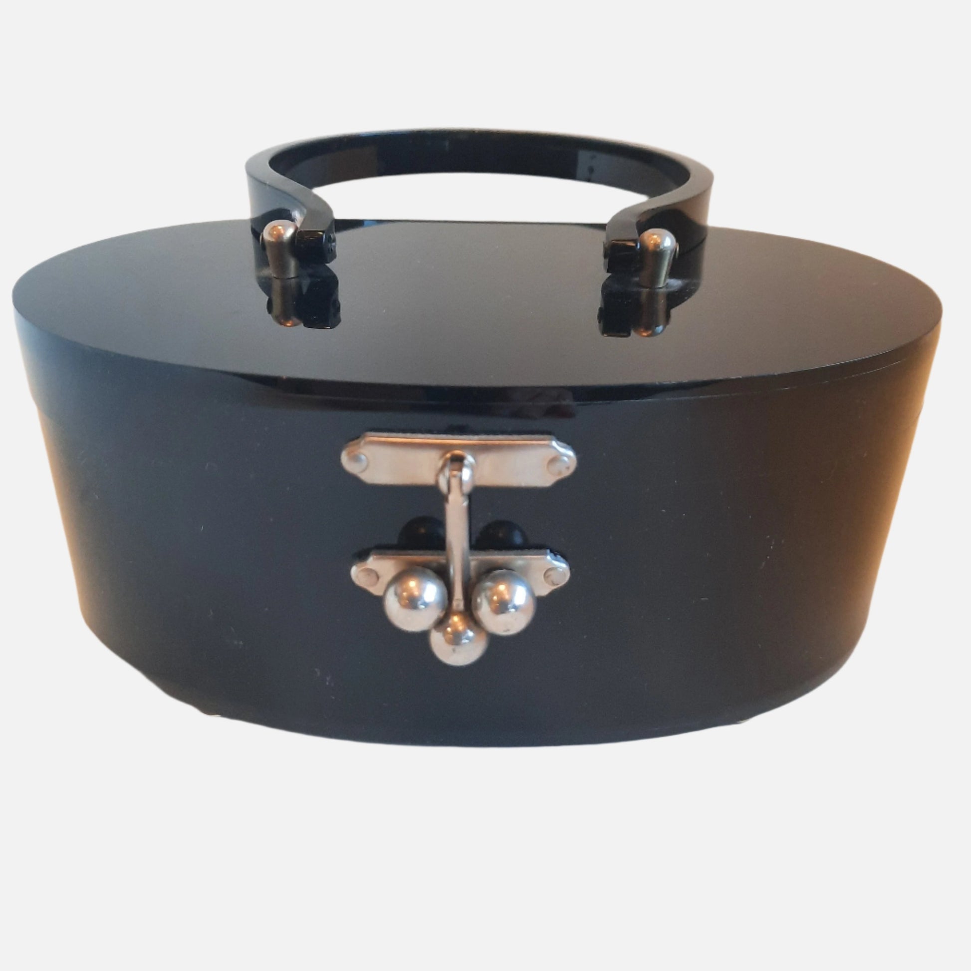 1950's black Lucite purse, in a classic oval shap, and a keyhole round matching black handle Original clasp still functions, and mirror is still intact. Label has fallen off due to age. A timeless fashion accessory!