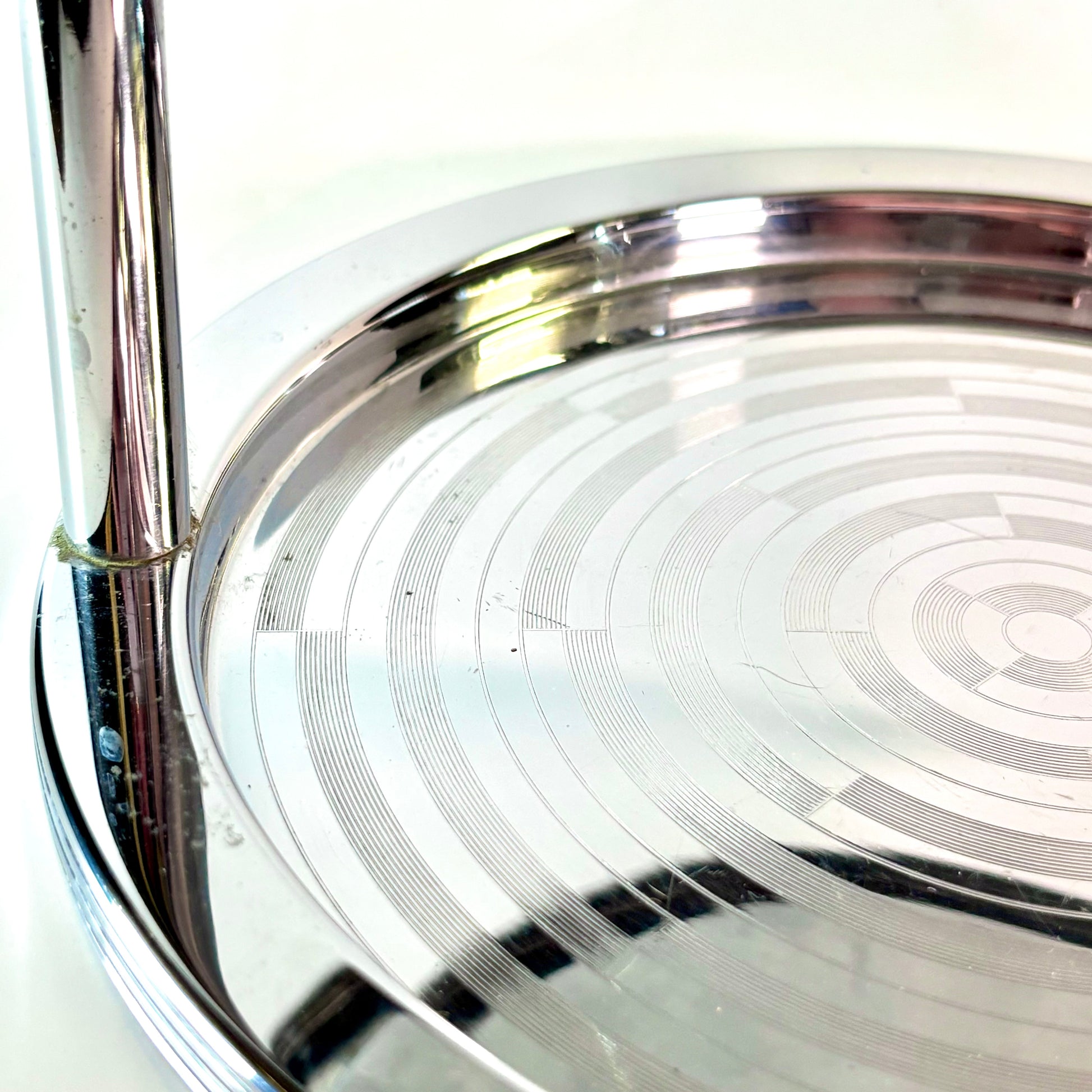 This gleaming two-tier chrome cake stand, is a striking piece from the celebrated Chase Chrome collection of the 1930s. Featuring a classic Bakelite handle and a highly reflective finish, it embodies the sleek, modern aesthetic that defined the Deco era. The pattern on the trays is ultimate art deco style.