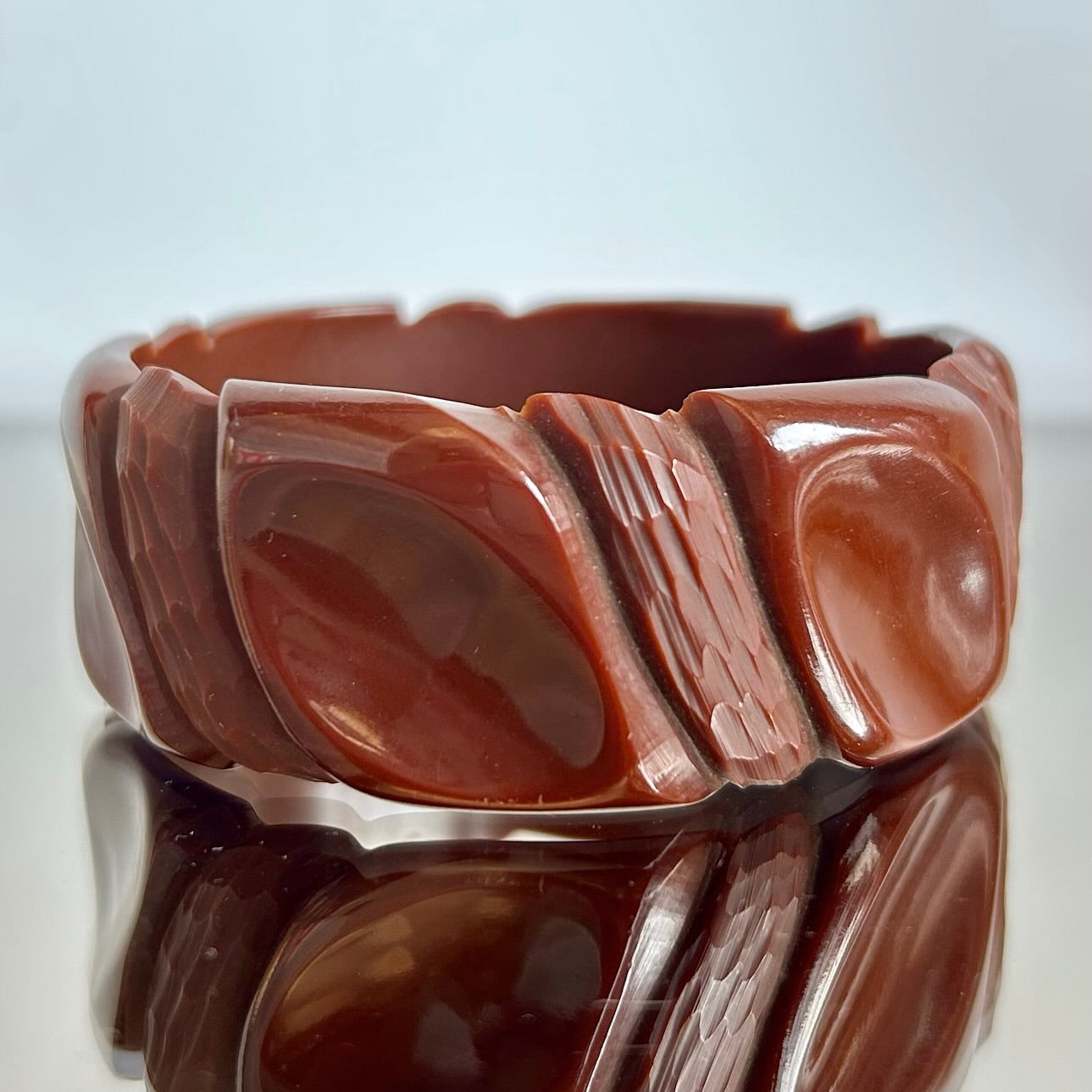 This classic Bakelite bracelet in chocolate brown dates to the 1930s era. It is in very good vintage condition.