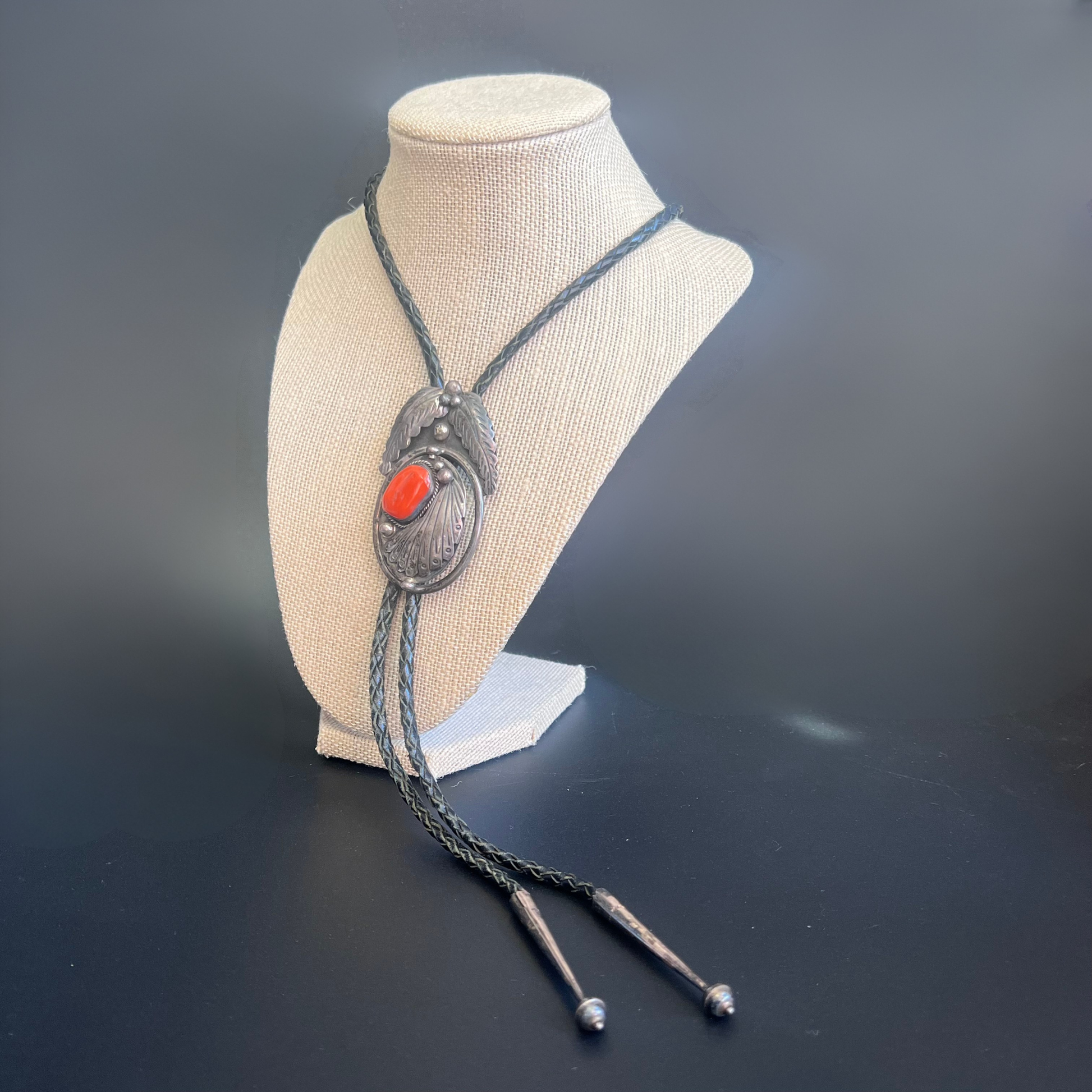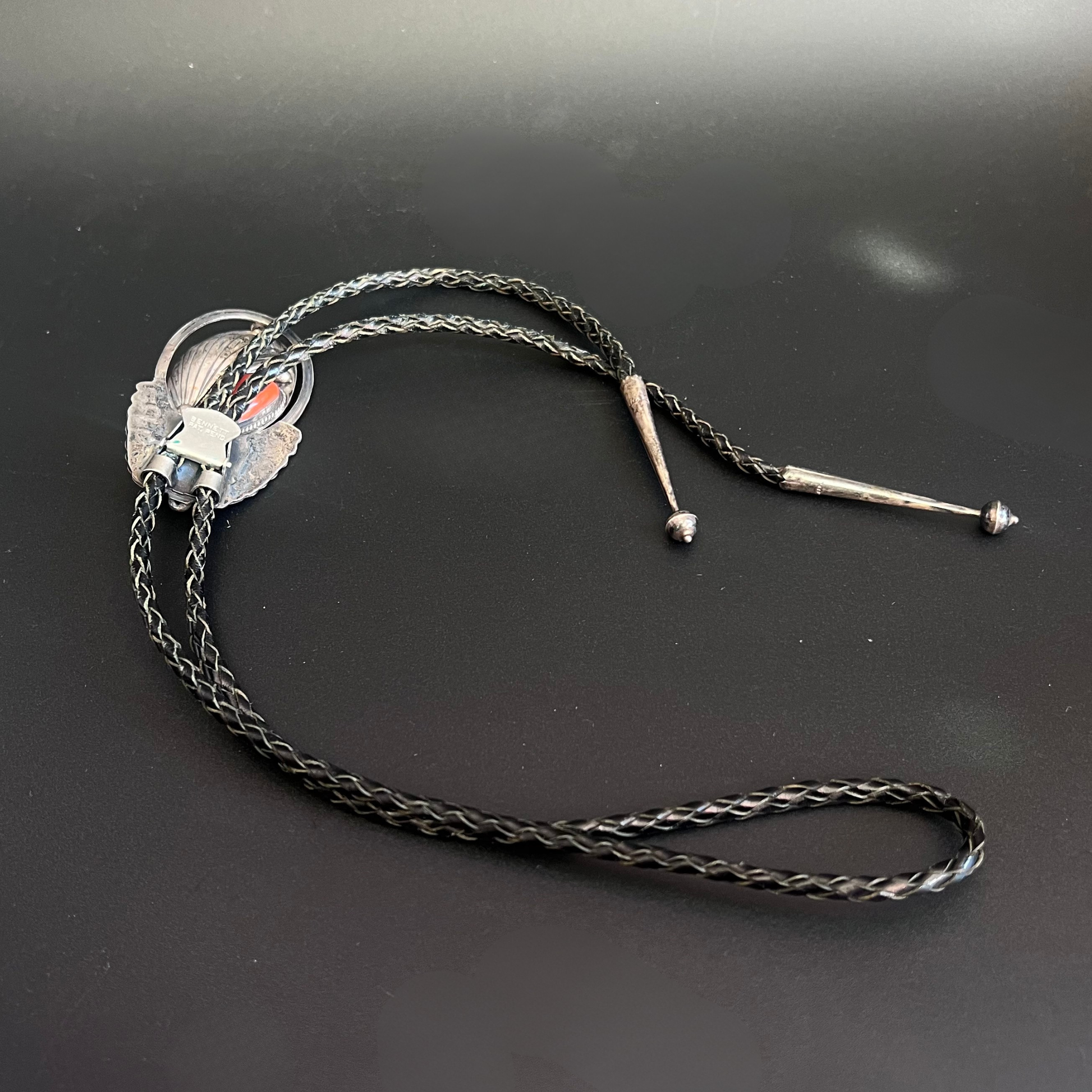 Vintage Bennett Turquoise and Coral Two-sided Bolo Tie with black leather braided cord. Unique two sided rotating pendant, one side includes a turquoise stone, the other side includes a coral stone. Although an identifying marker is not present, based on the fact that it is produced by Bennett, it is likely sterling silver.