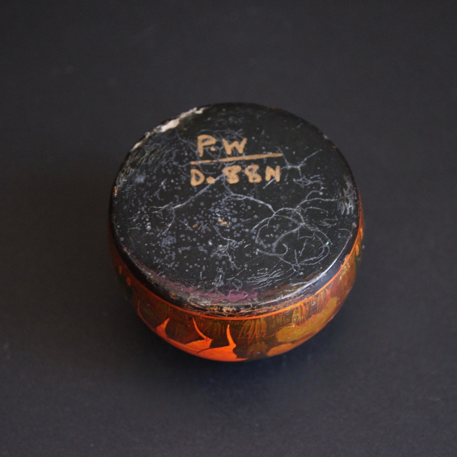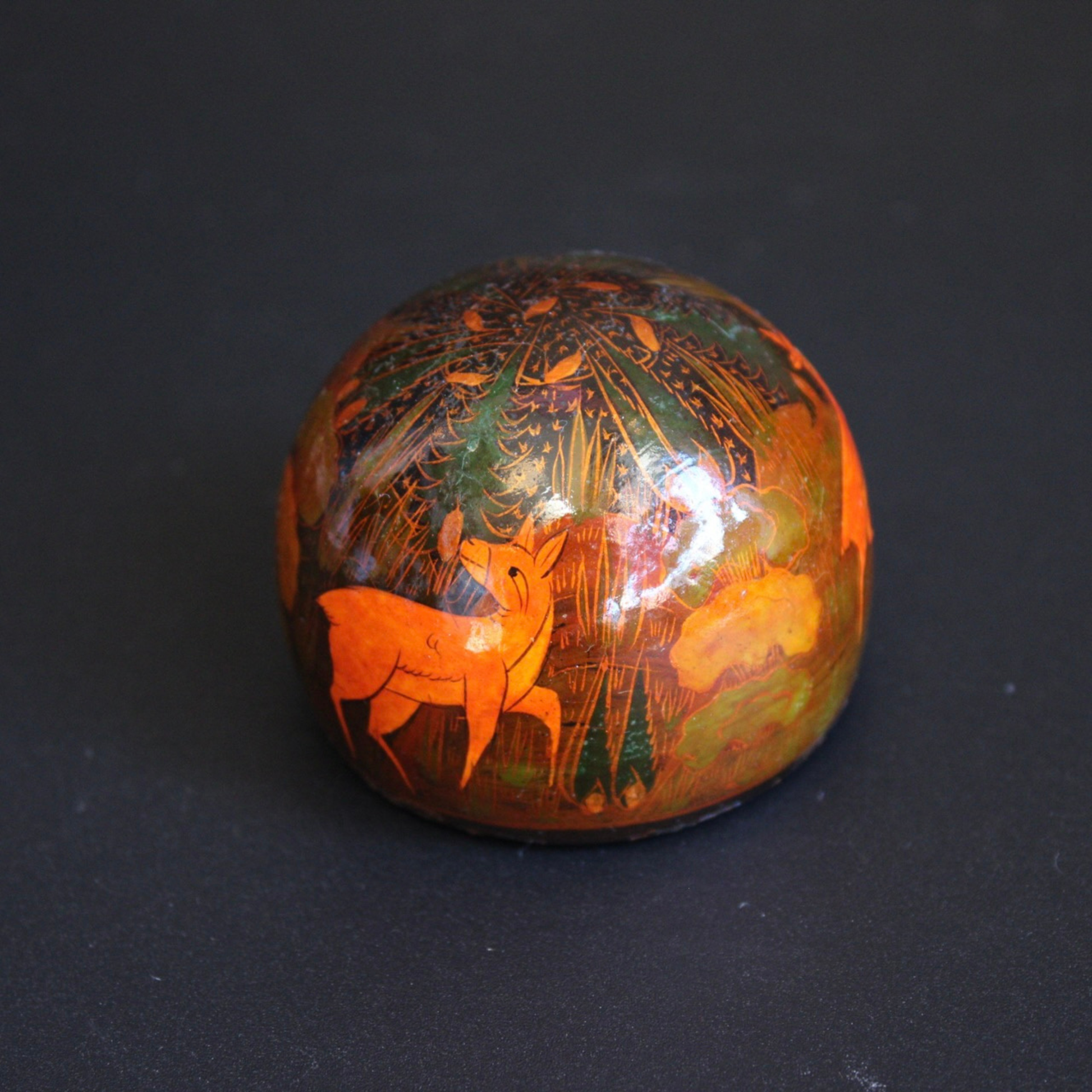 This vintage Eastern European paperweight is a bit of a mystery, but it sure is a unique find! This paperweight is made of wood and features a painted or enameled nature scene with woodland creatures.