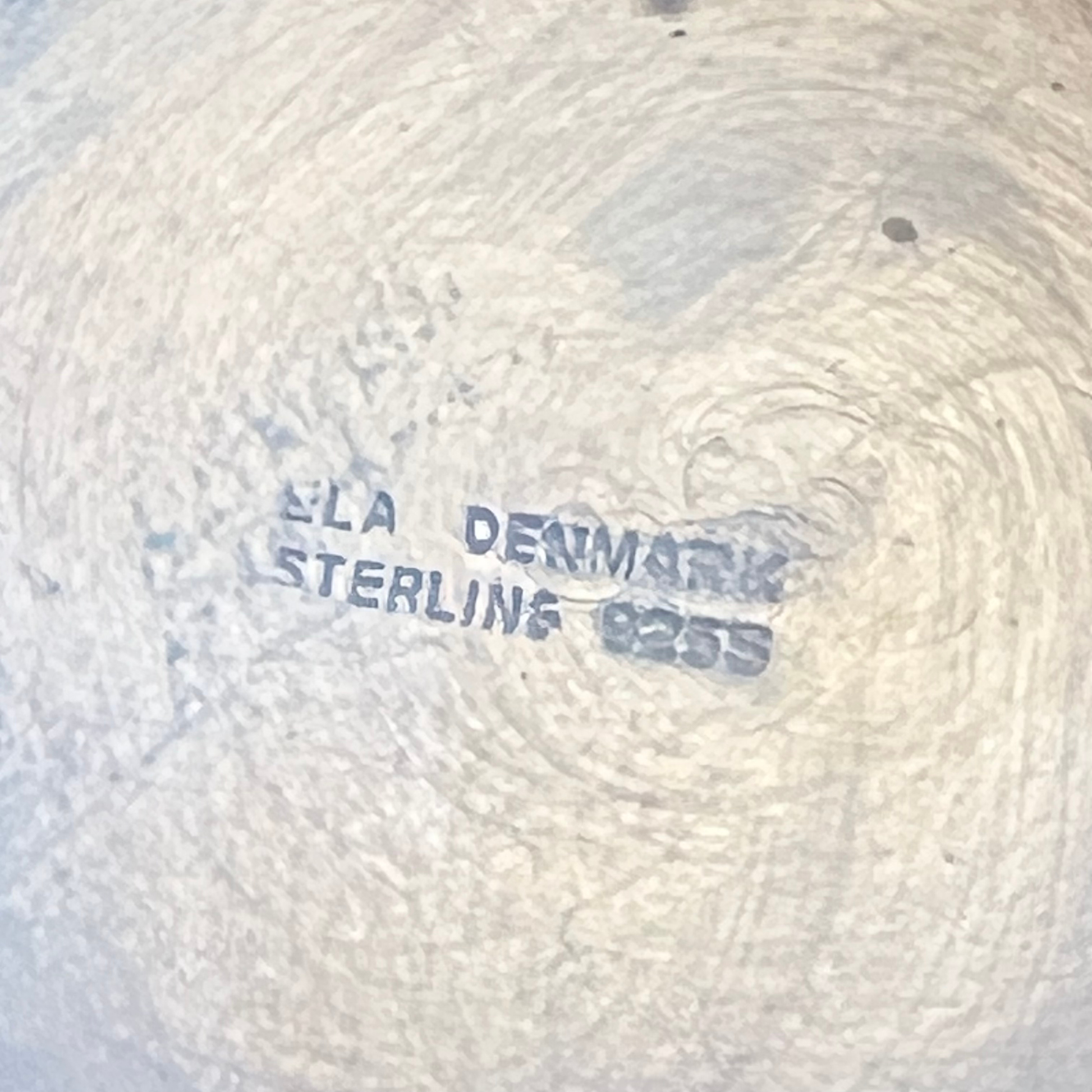 This beautiful mid-century modern salt and pepper set was designed by Egon Lauridsen (ELA) in Denmark. Crafted from sterling silver and finished with rich cobalt blue enamel, each shaker features a delicate mushroom shape with finely patterned tops, one with a single dispensing hole and the other with several. The enamel is in good condition with no chips or cracks, and the silver has interior tarnish from use with salt and pepper and the exteriors has minimal tarnish from age. A striking example of Danish craftsmanship and timeless design. Marked "Ela Denmark" & Sterling