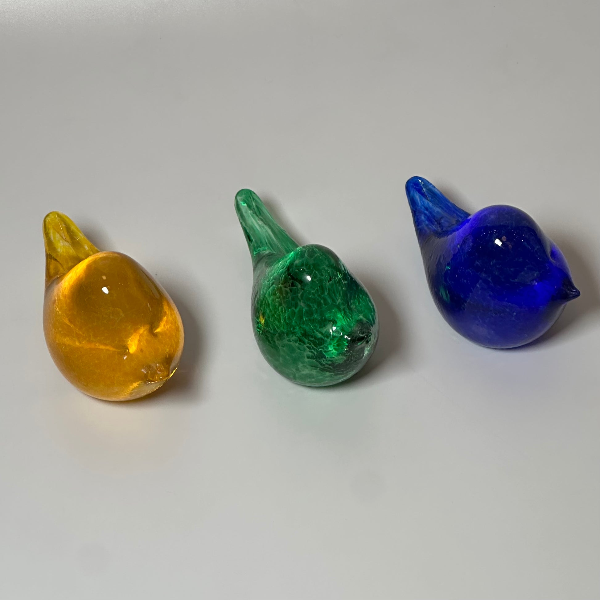 A charming trio of handcrafted Henrietta Glass birds in vibrant blue, sunny yellow, and fresh green. These delightful pieces showcase the playful artistry and brilliant colors that made Henrietta Glass beloved by collectors. Perfect for adding a pop of color and whimsy to your windowsill, shelf, or curio cabinet. Collect all three or let them find separate homes—each bird brings its own personality and handmade charm.