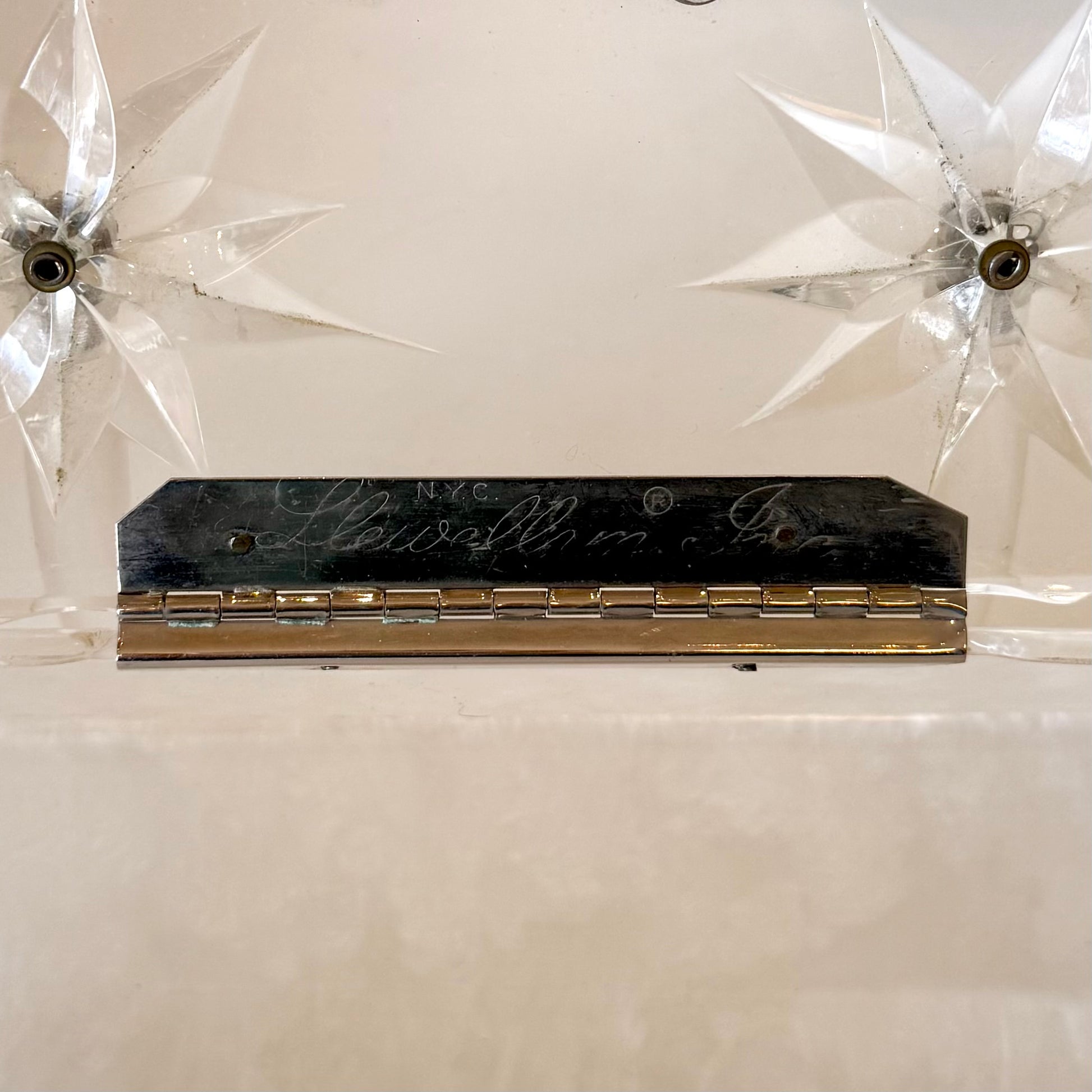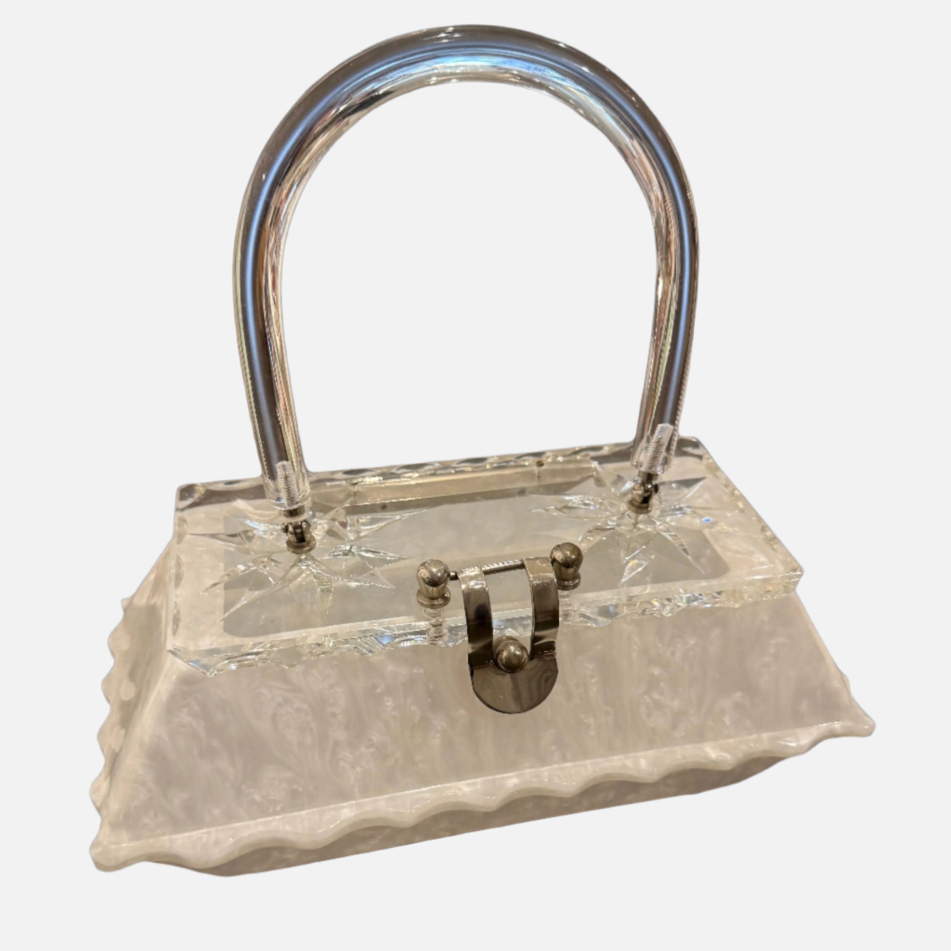 This collectible 1950's Lucite purse by Llewellyn original design in a pearly white color, with a clear top that features a mod starburst design at the connections of the handle. The shape is reminiscent of a geometric ravioli. It has the Llewellyn Inc NYC stamp on the hinge.
