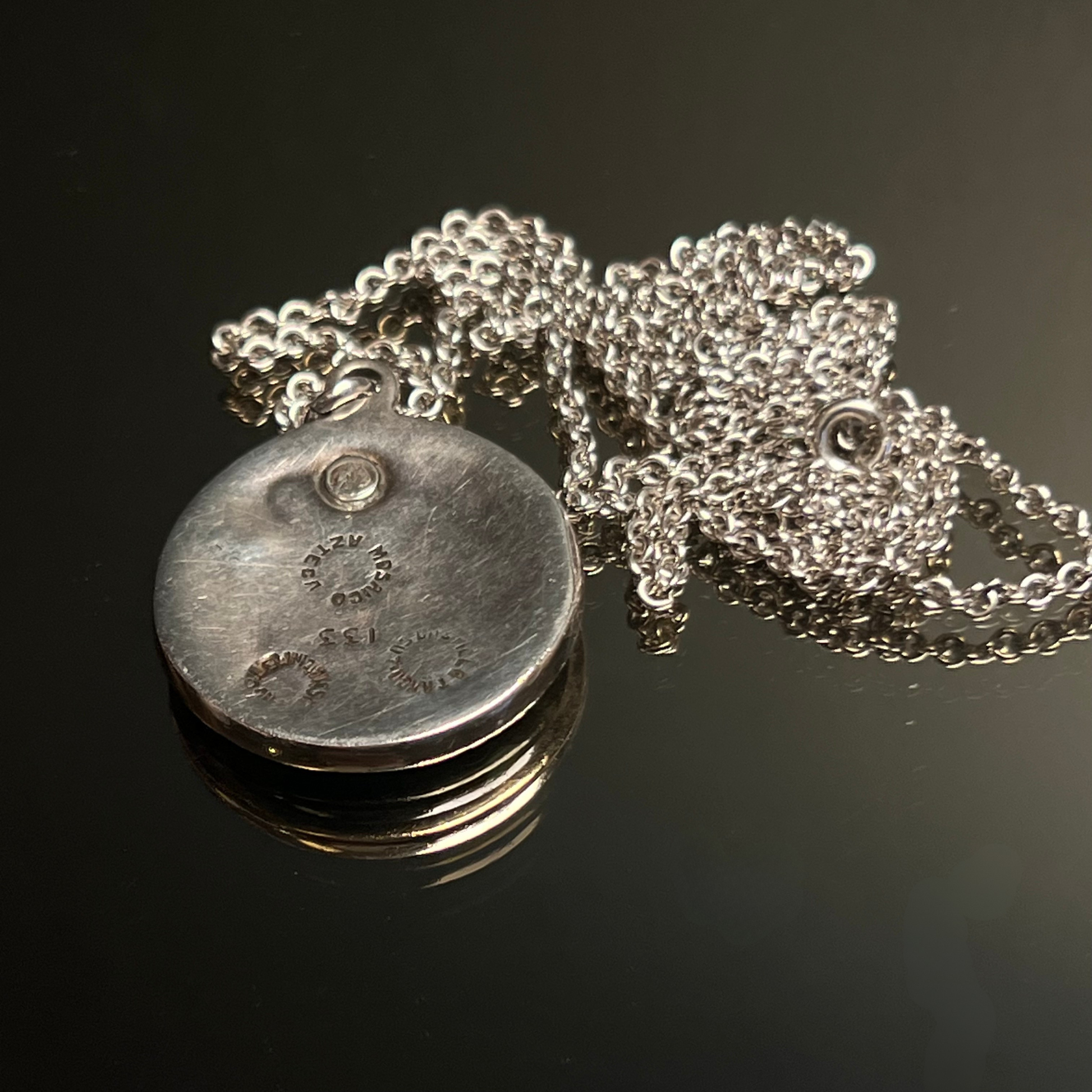 This vintage necklace was crafted by Los Castillo, a renowned Mexican silversmith celebrated for exquisite mid-century designs. The pendant features the letter “L” with vibrant stone inlay, showcasing the brand’s signature artistry. The back is stamped with Los Castillo Taxco, Sterling Silver, 133, and Mosaico Azteca, confirming its authenticity and highlighting the iconic inlay technique. Lightweight and elegant, it’s a stylish piece that combines timeless design with collectible Los Castillo craftsmanship.
