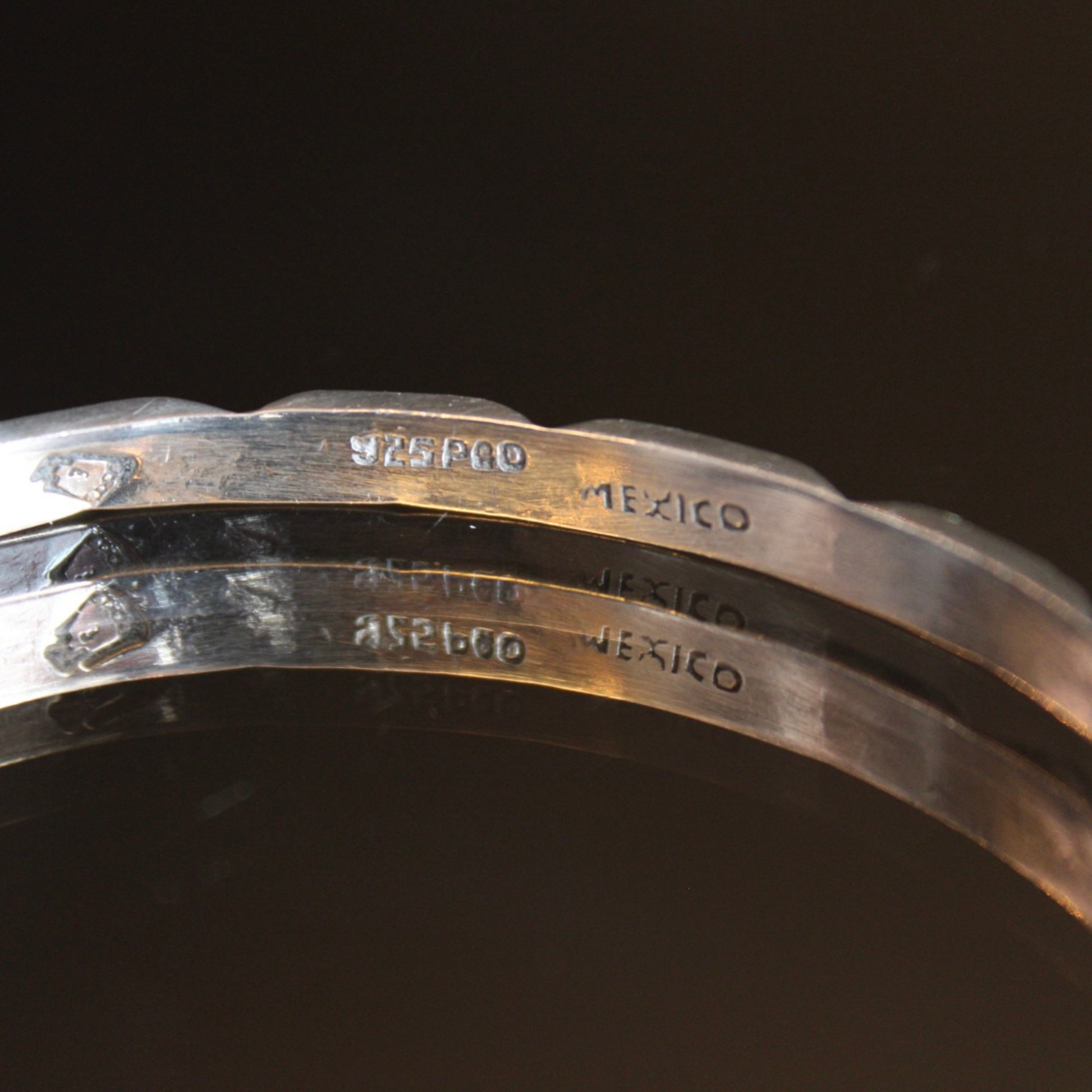 Vintage Mexican Sterling Silver bangle bracelet with a unique notched detail. Stamped with an eagle symbol, "Mexico", and "925 POO". The eagle symbol on Mexican silver is a government assay mark, used primarily from 1948 to around 1980, guaranteeing sterling quality and identifying the manufacturer with a number, often inside the eagle's chest. This eagle marking has a 3 in the center, identifying this as Taxco silver which is a very high quality, renowned silver.
