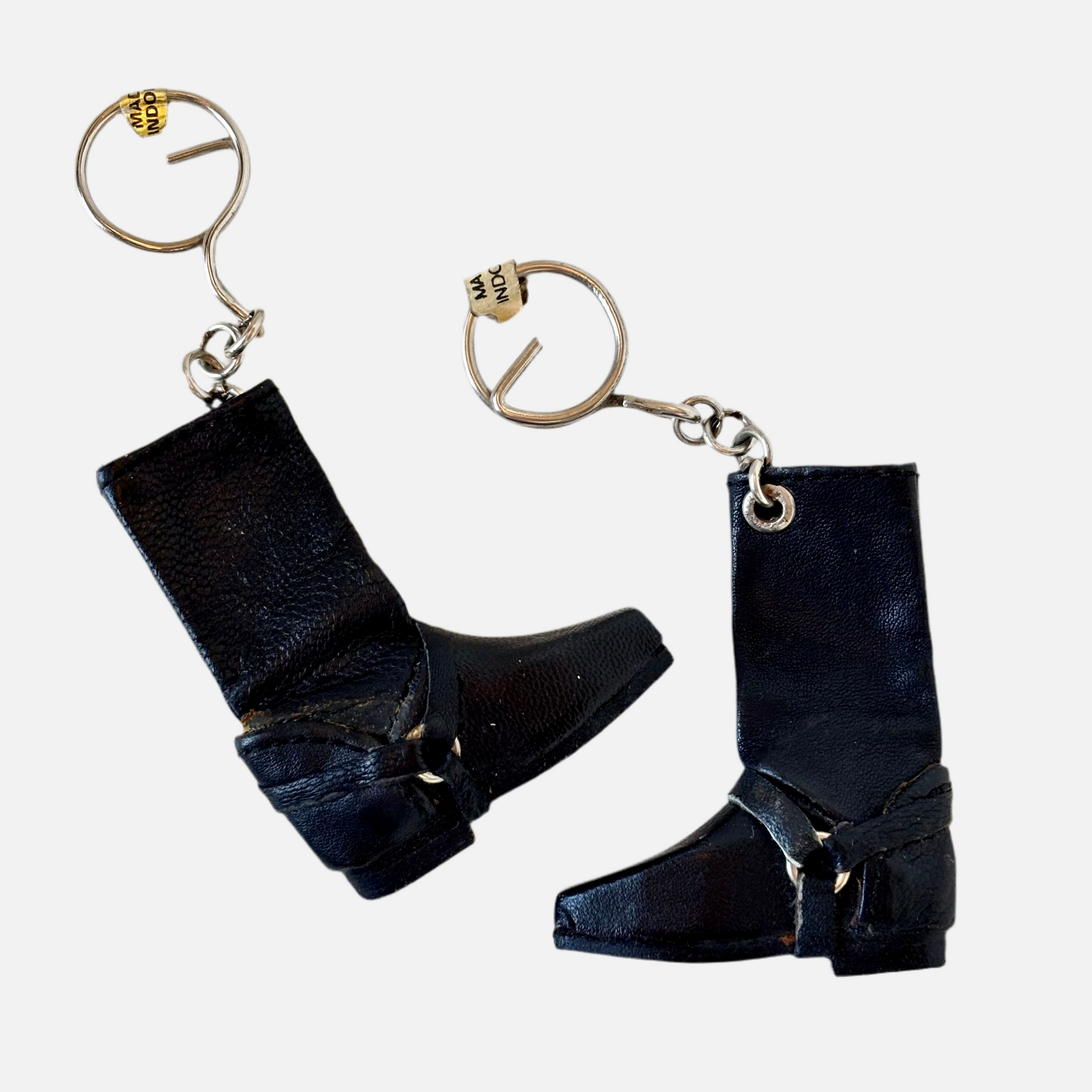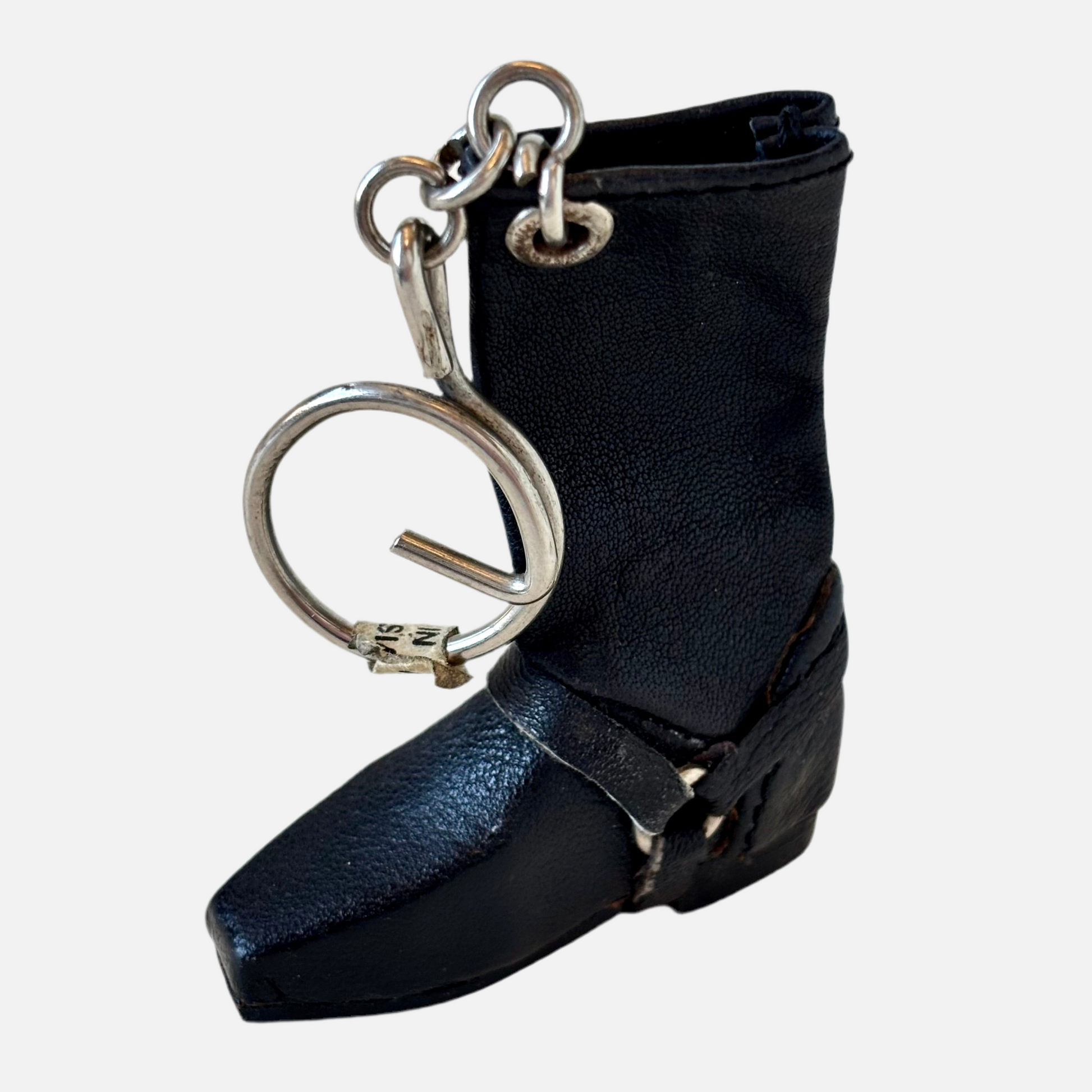 An adorable miniature boot keychain made with genuine leather, measuring 3 inches in height, and 2 inches across the length of the boot