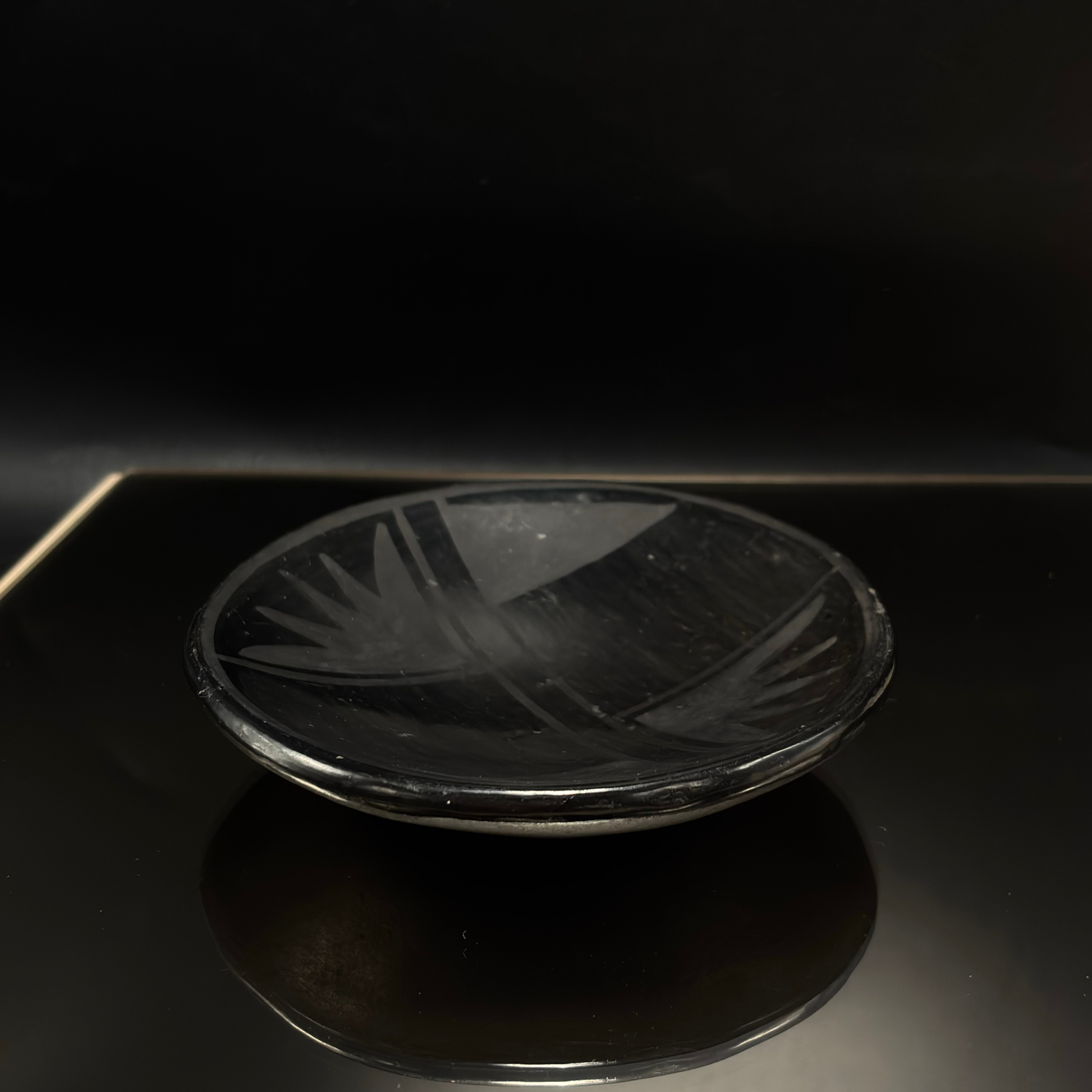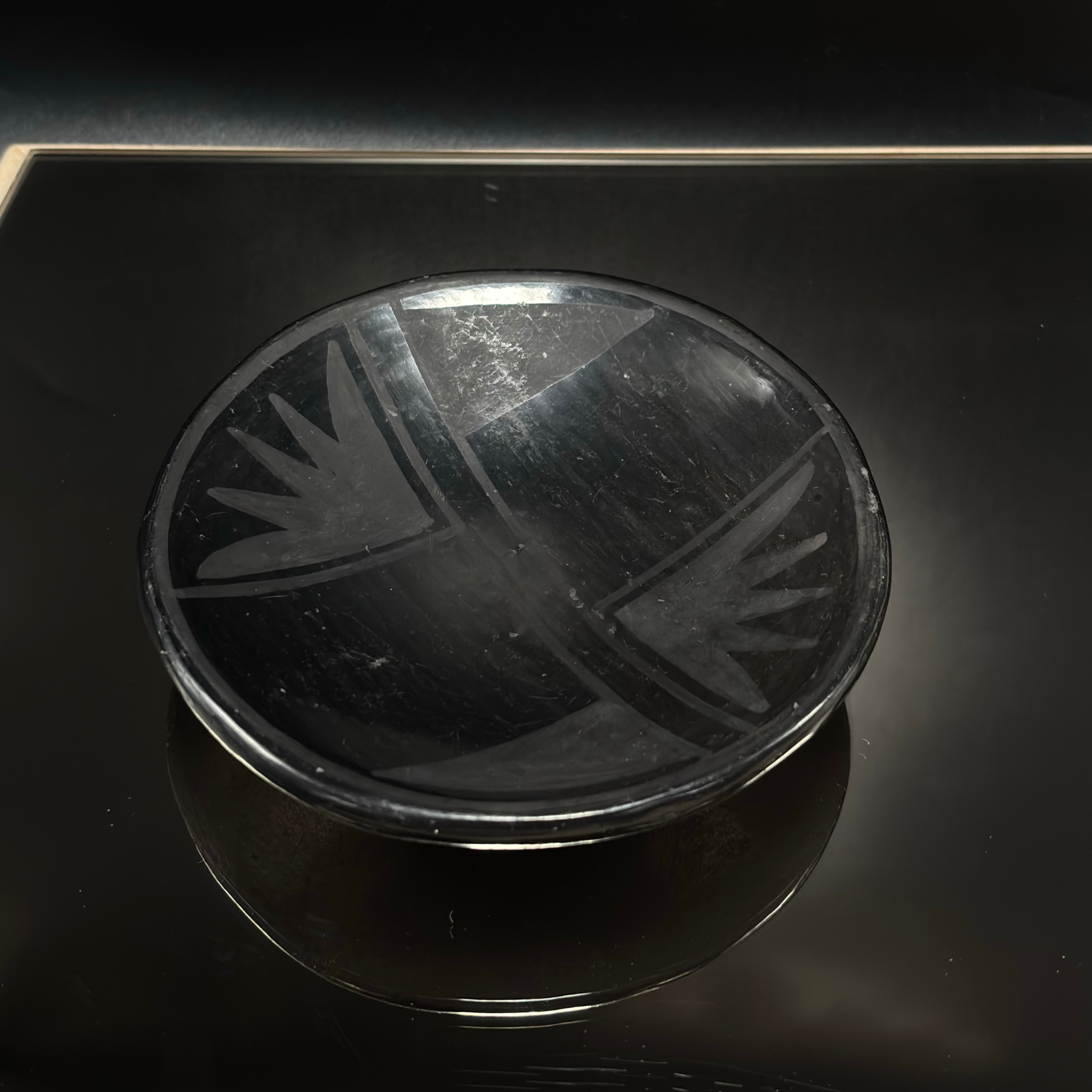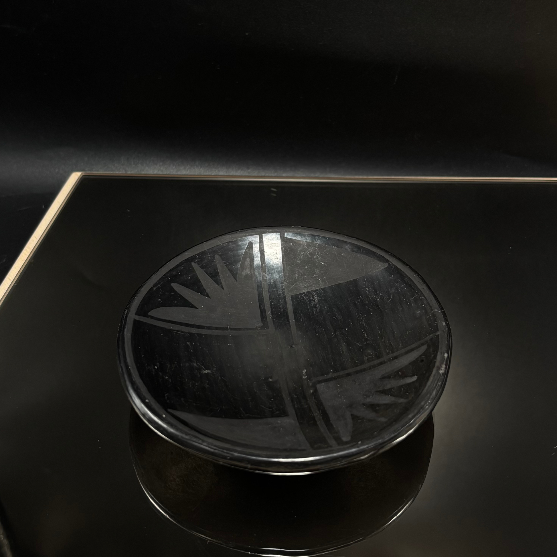 We are so excited to present you with this gorgeous dish, a perfect representation of her beautiful work, featuring a combination of matte & gloss blackware in a classic southwestern motif. This dish is signed "Tonita" on the back, and is in good vintage condition, with some surface wear due to age. 4" diameter.