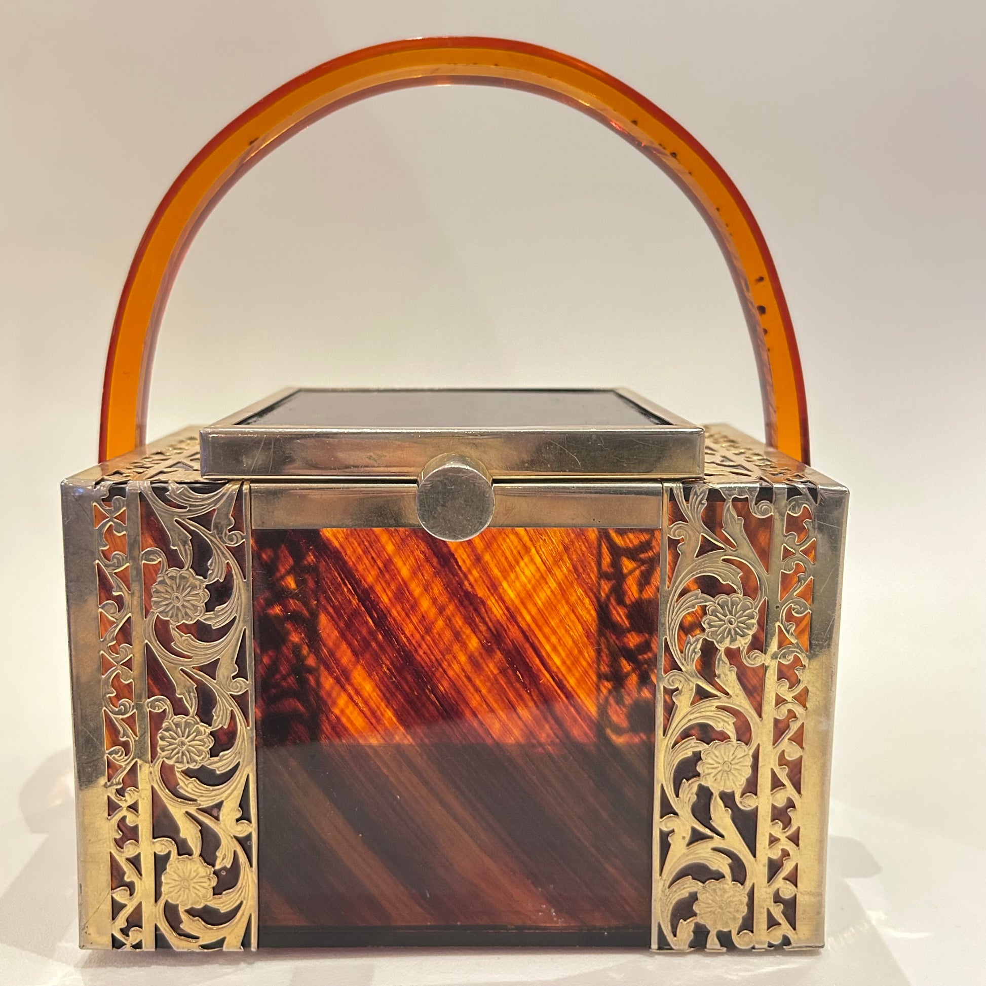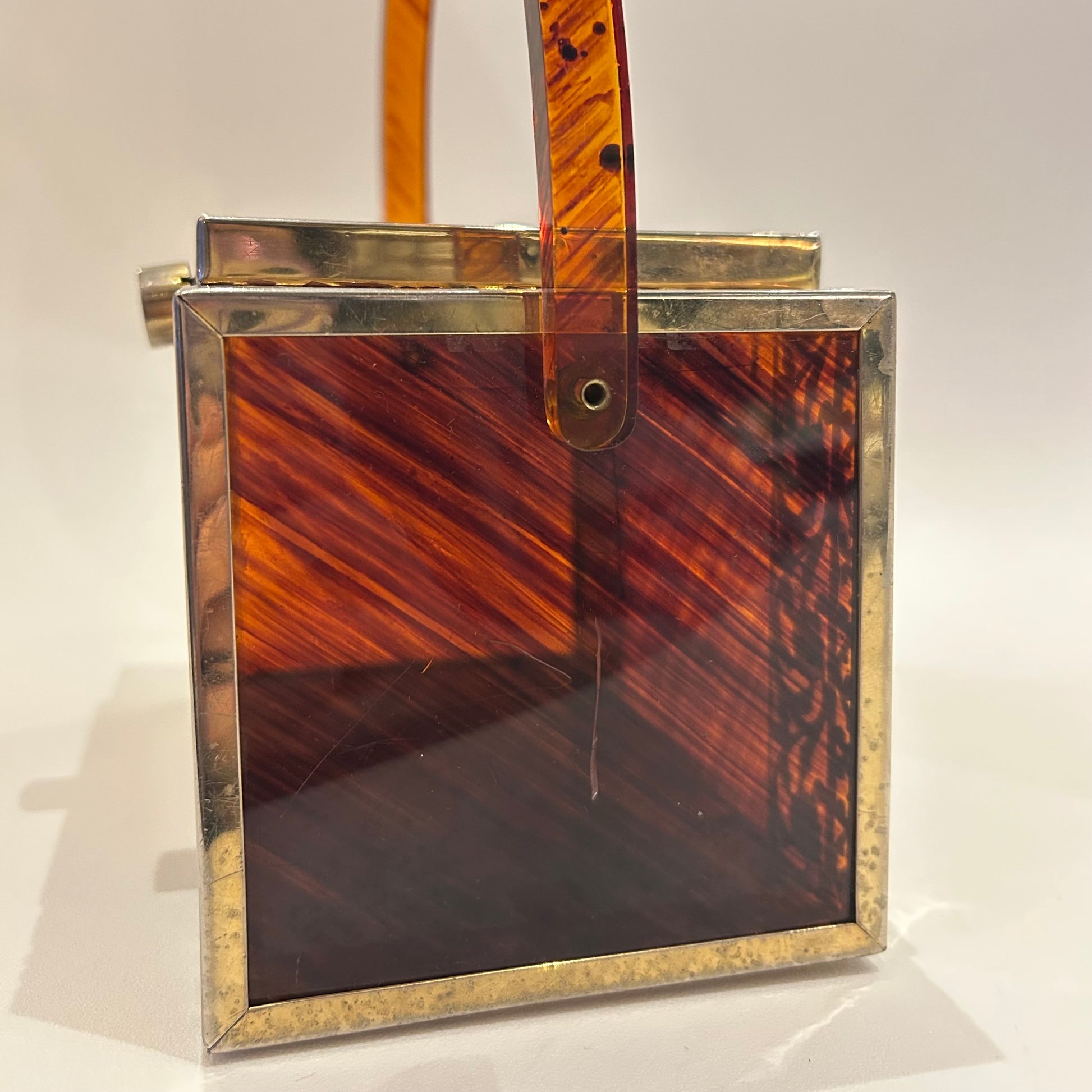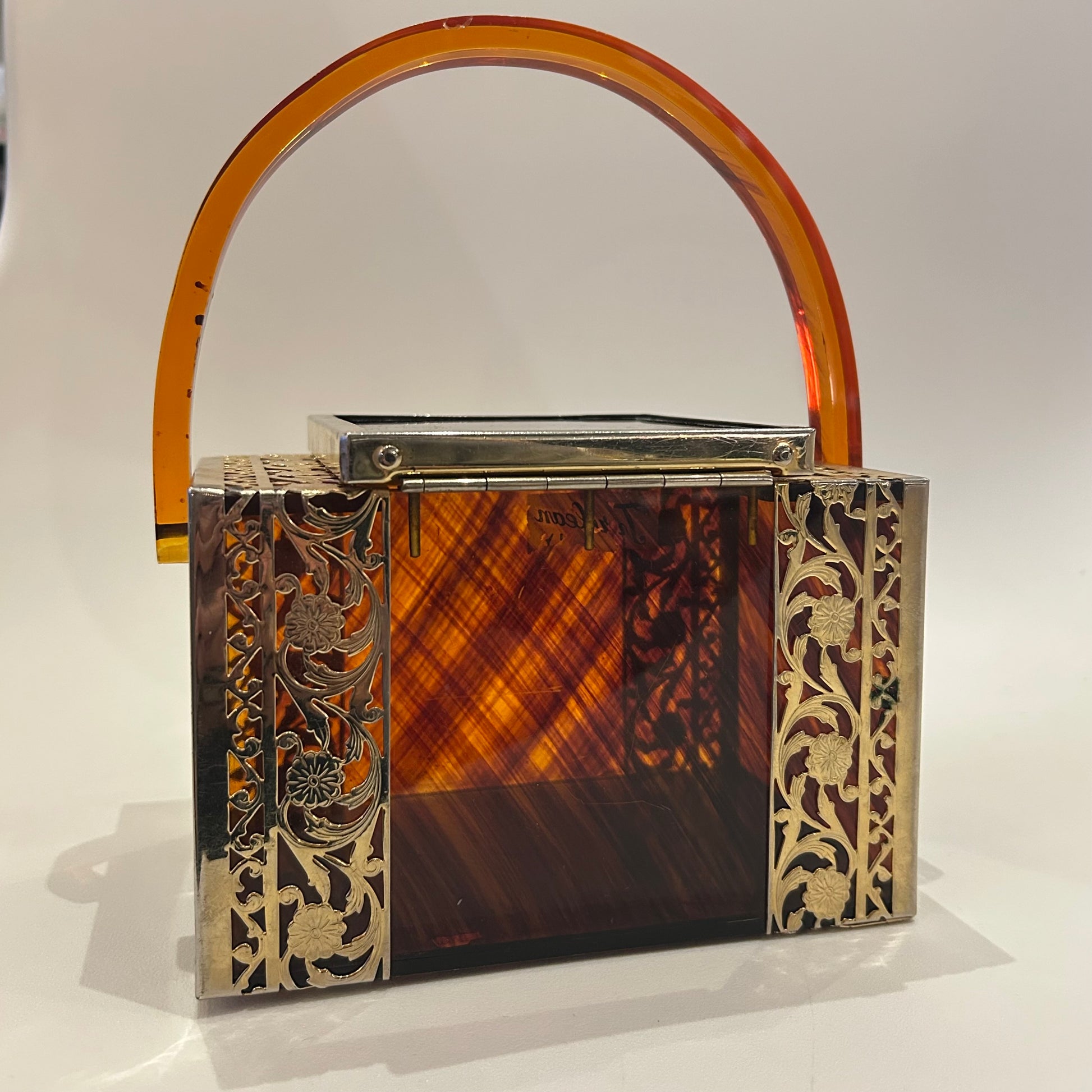 Classy vintageTyrolean New York (marked on interior) Lucite amber & gold floral rectangular purse. It has one carrying handle with some discoloration with age, as well as minor surface scratches on the front & one on the side. An lovely vintage addition to any fashion collection.