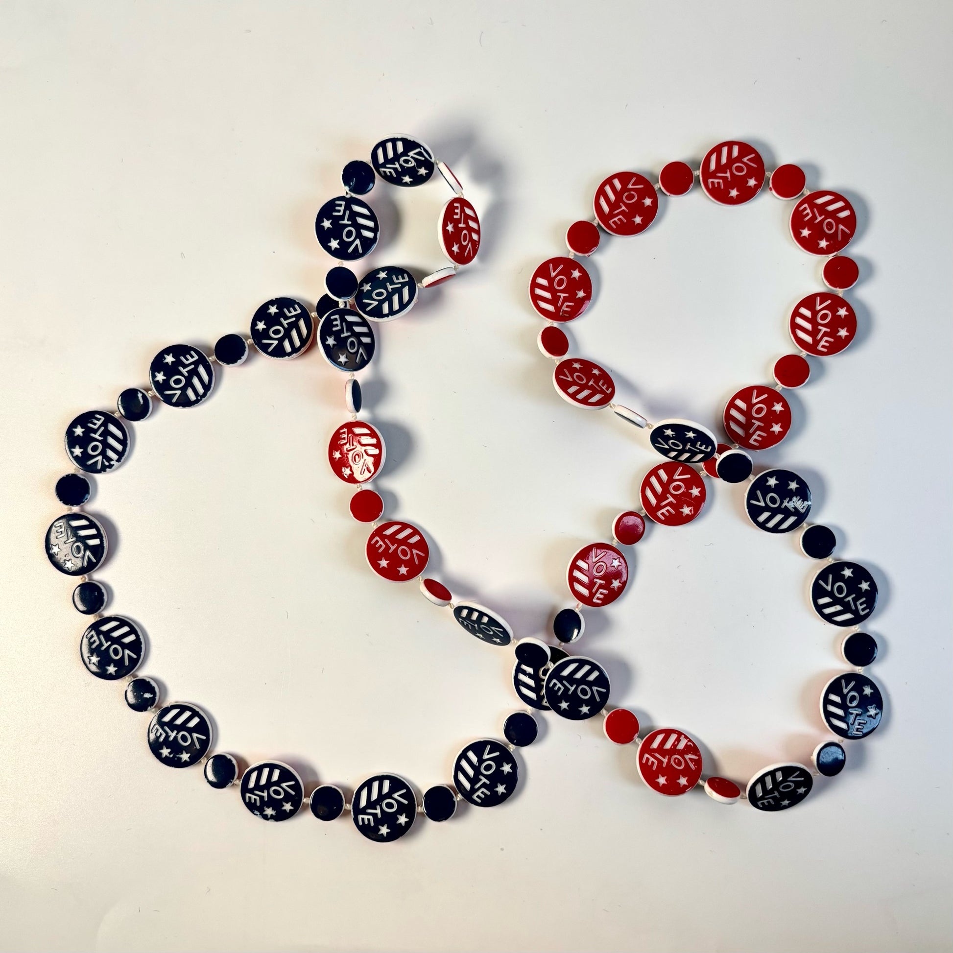 This red and blue necklace says just 1 word: Vote. It dates to the 1940's and each disc is red on one side & blue on the other. An important necklace then and now, with a modern take on stars and stripes.