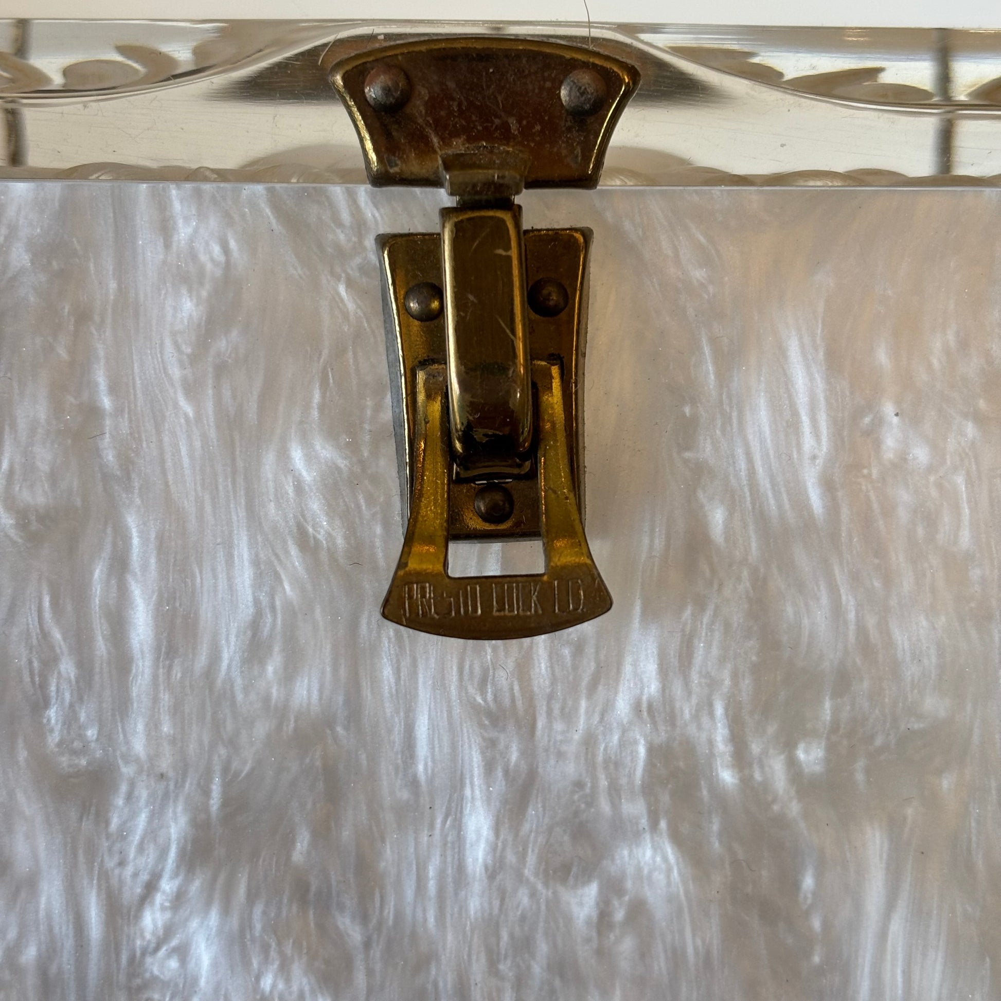 1950's rectangular Lucite white pearl purse with a very unique circular handle that curves into the sides of the purse & clear lid. The Presto Lock Co clasp and hinge are in good working order. An amazing vintage addition to any fashion collection.