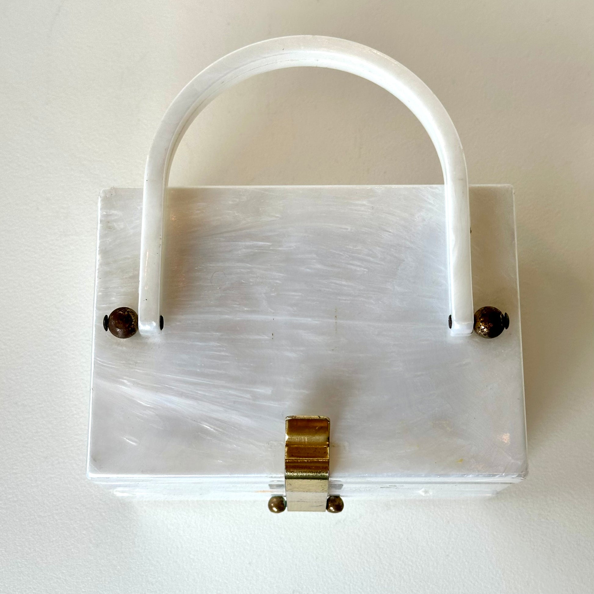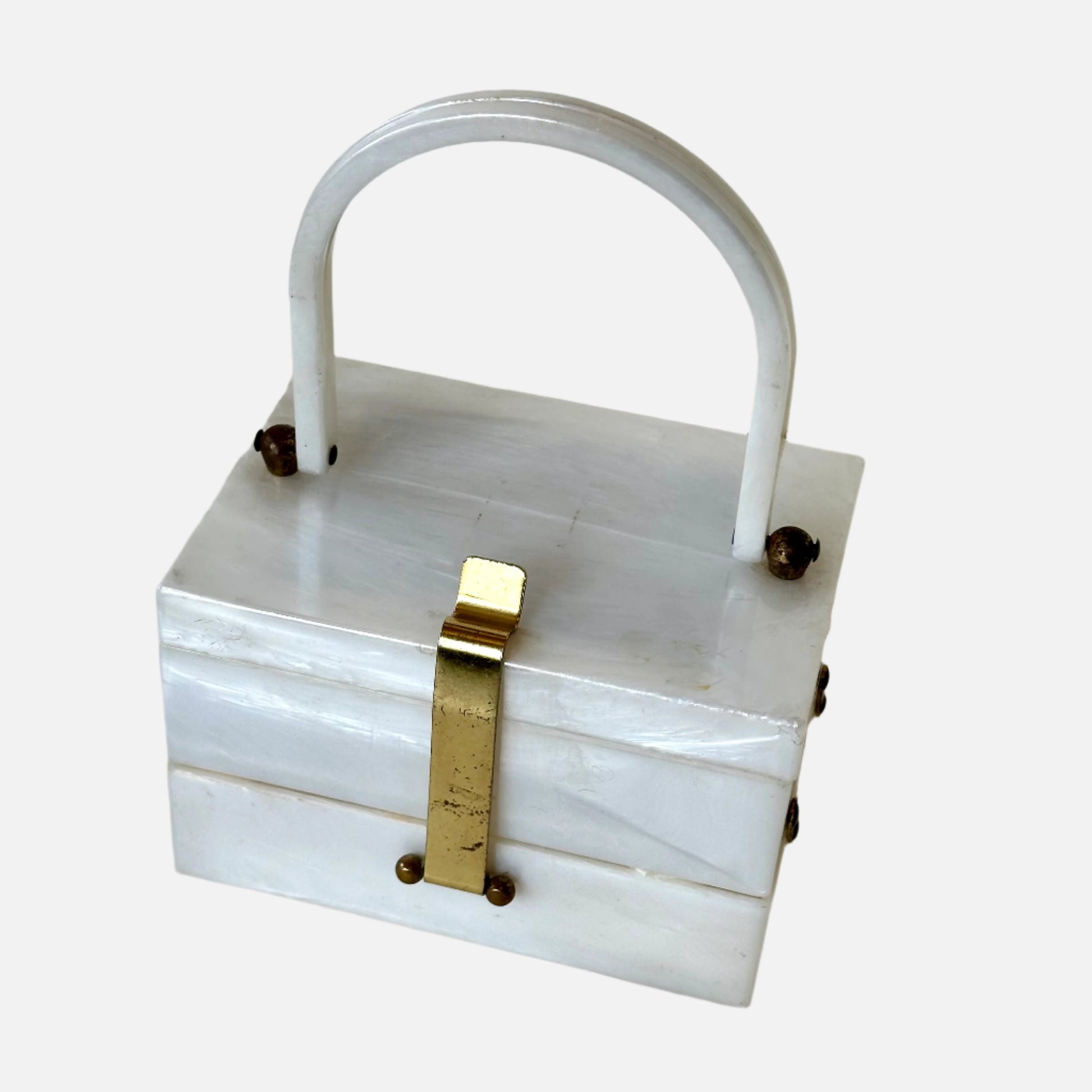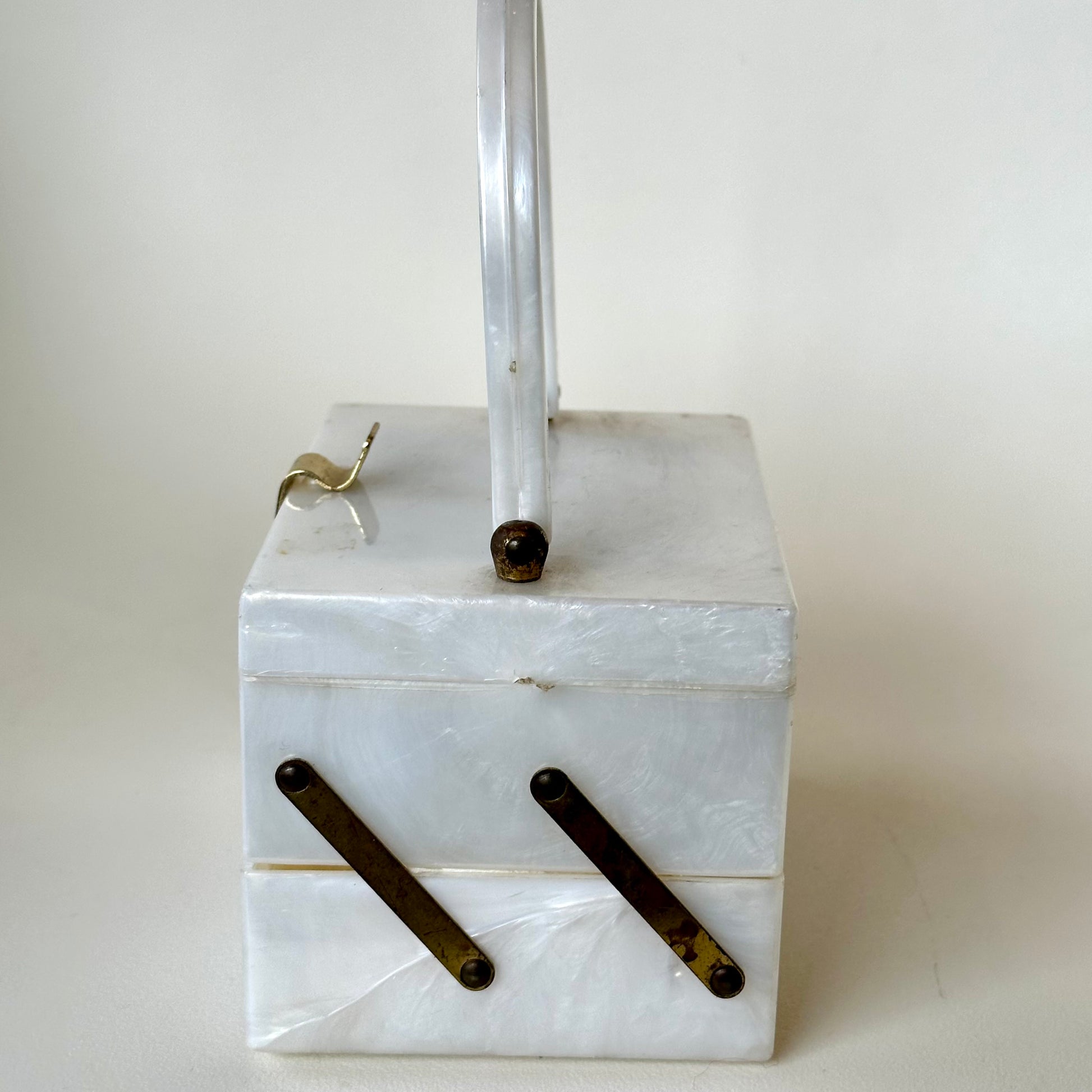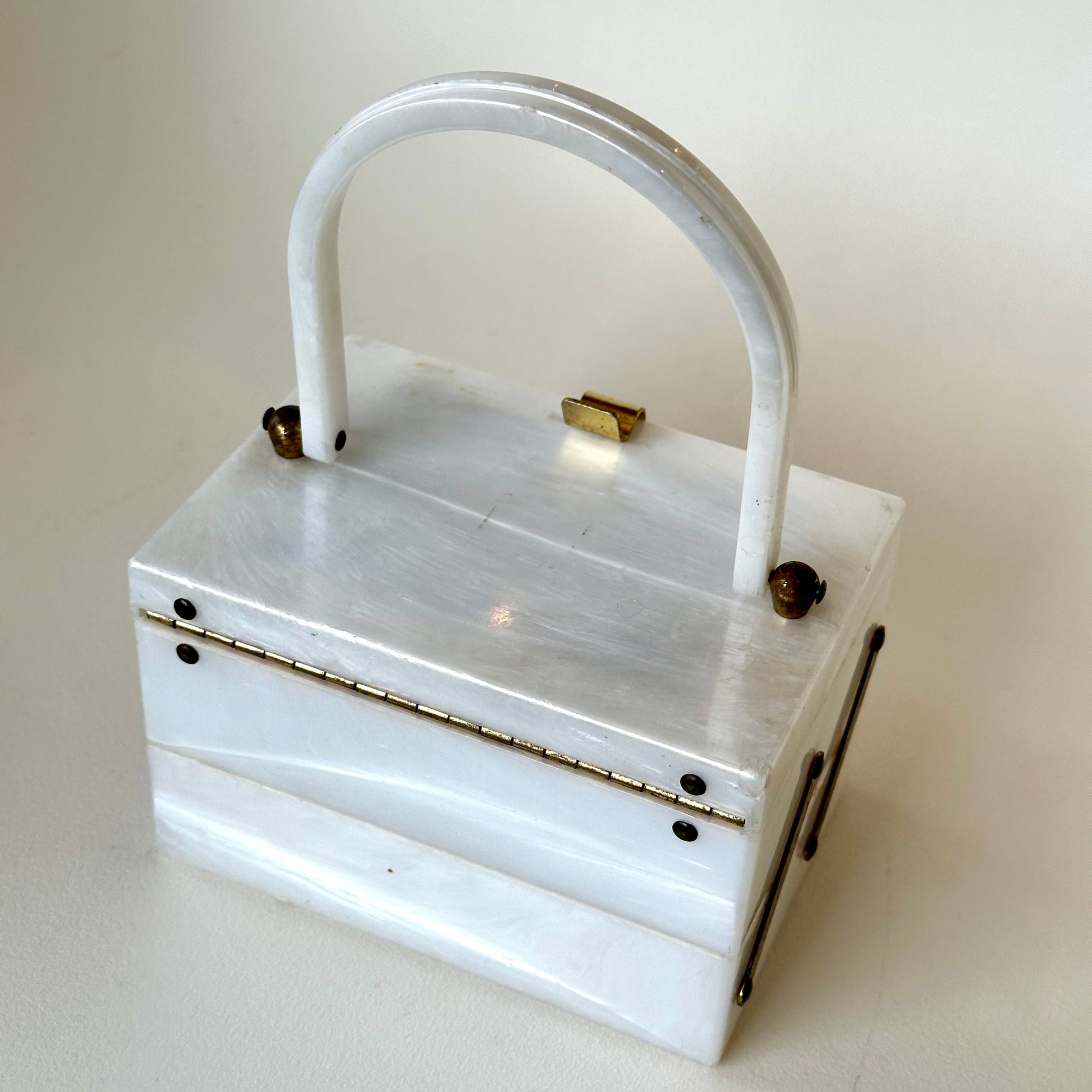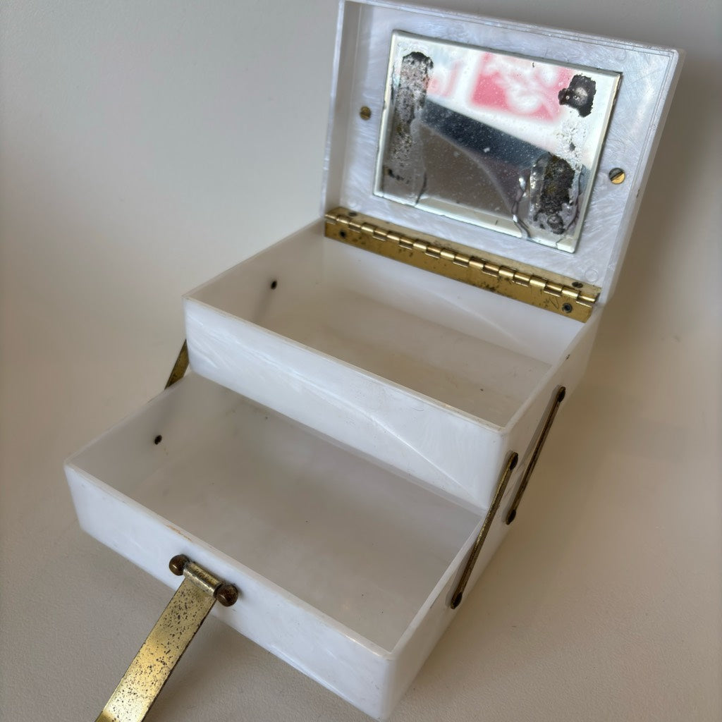 1950's small Lucite purse with a hinges for 2 levels. The clasp and hinge are in good working order, the metal shows some signs of wear. The mirror is old, but has an addionnal loose mirror inside. Reminiscent of a fashionista tackle box!